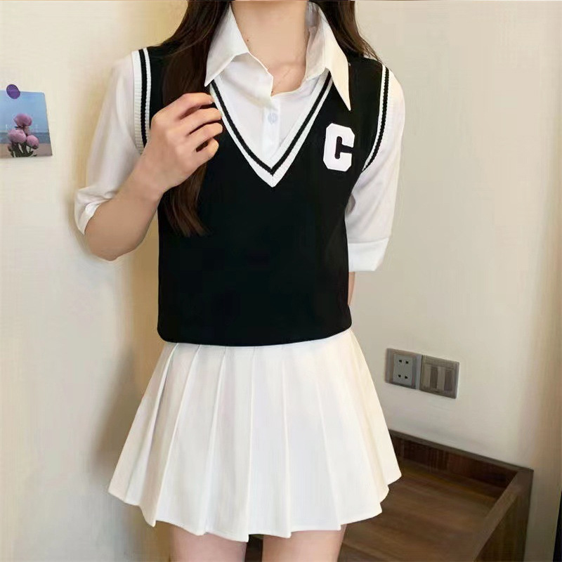 여름 2023 한국 스타일 아카데미 스타일 가짜 투피스 조끼 스택 셔츠 여성용 틈새 디자인 감각 반팔 니트 탑스토어 가기