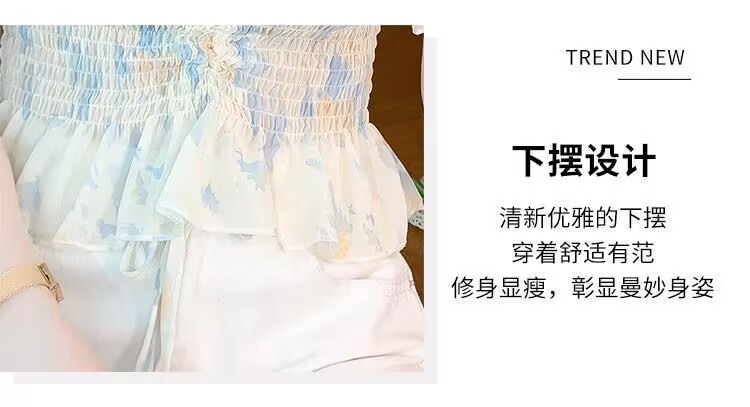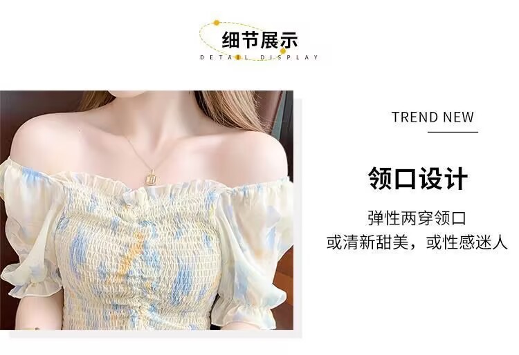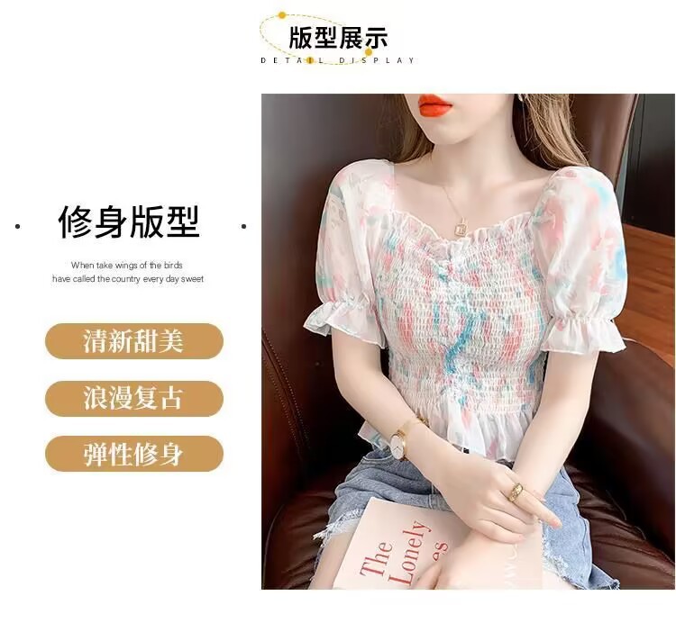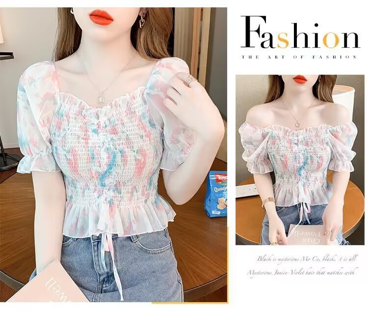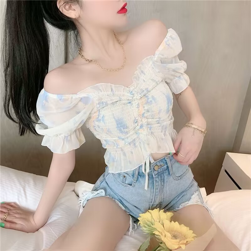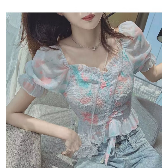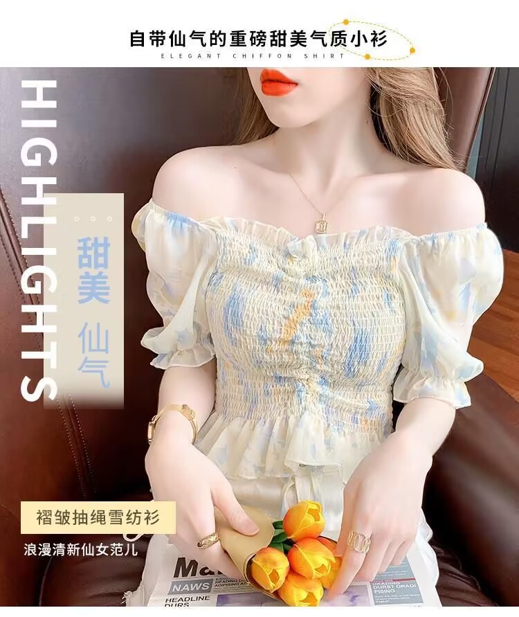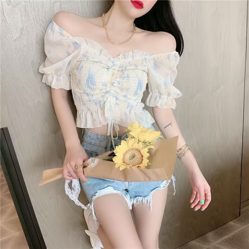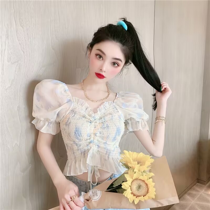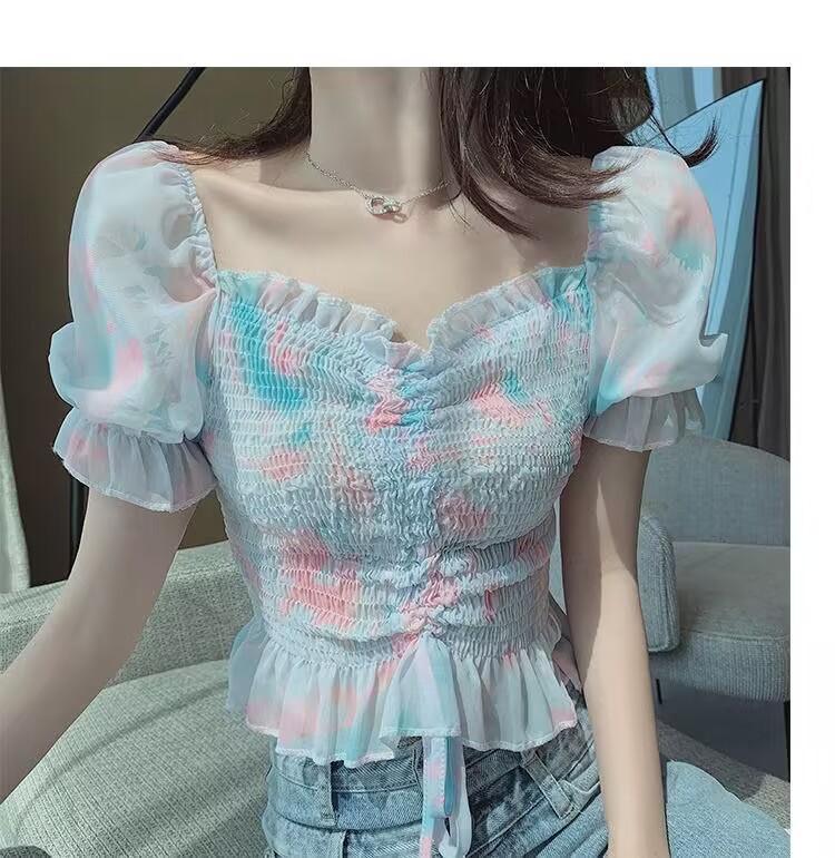 2023 여름 러플 플리츠 쉬폰 셔츠 달콤한 작은 퍼프 슬리브 졸라매는 끈 레이스 업 티셔츠 탑 여성 트렌디스토어 가기