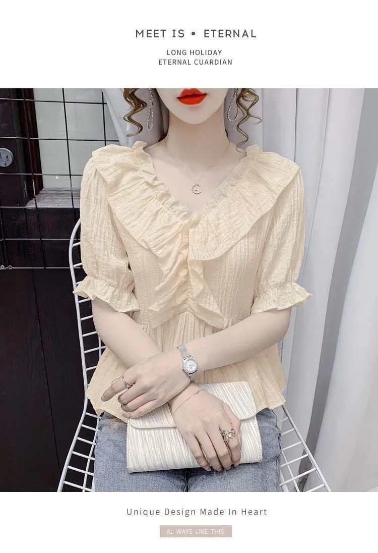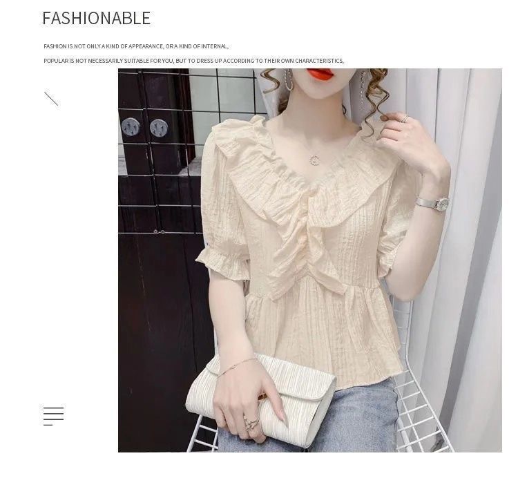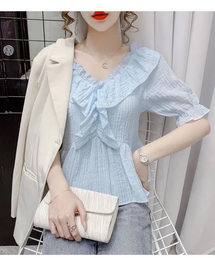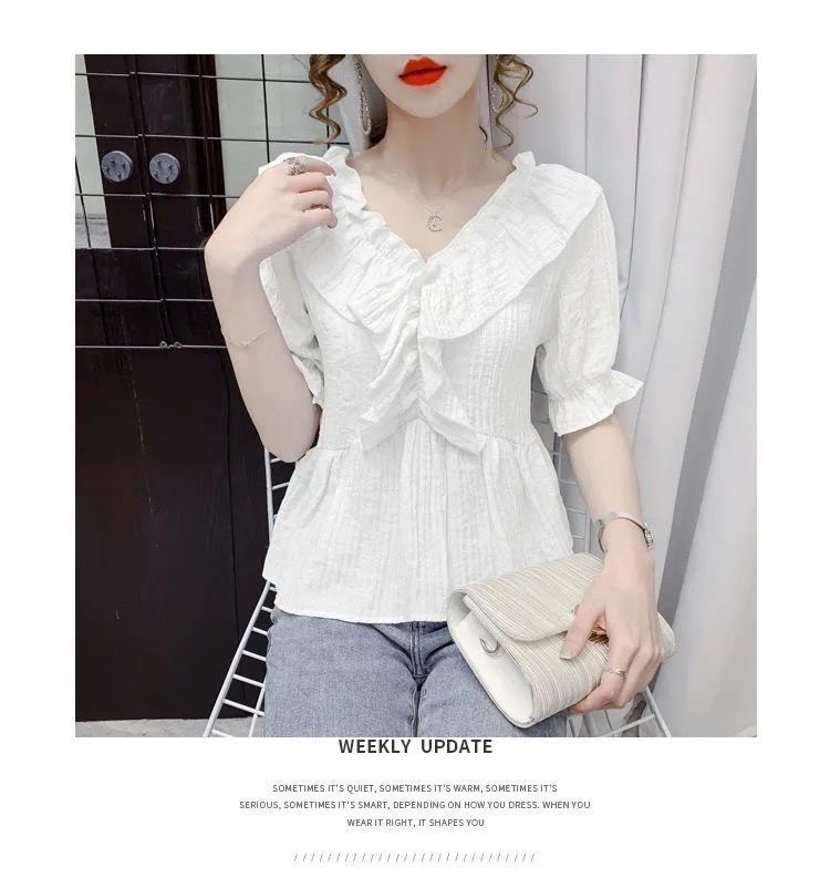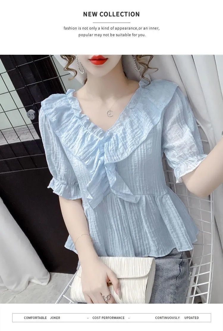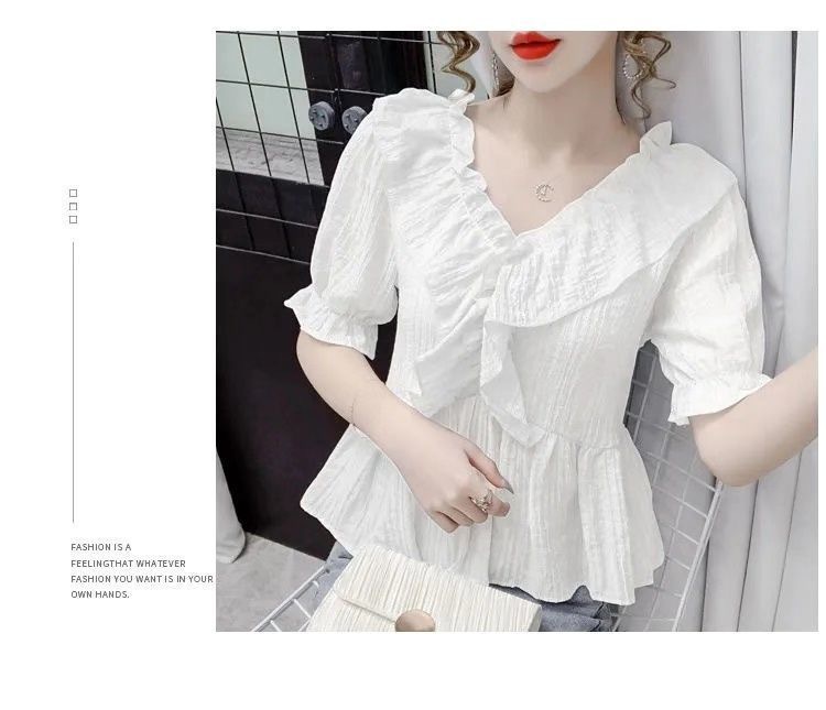 여름 새로운 프랑스어 v 넥 프릴 퍼프 반팔 셔츠 숙녀 다목적 패션 기질 탑 여성 티셔츠스토어 가기