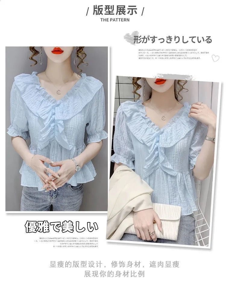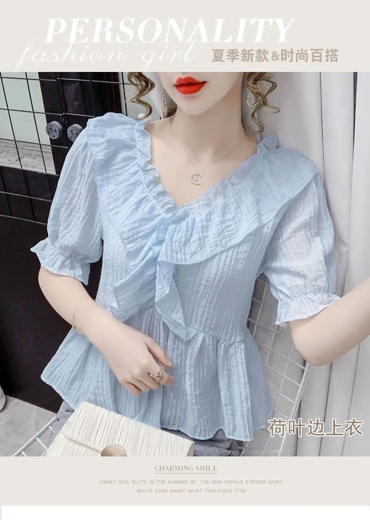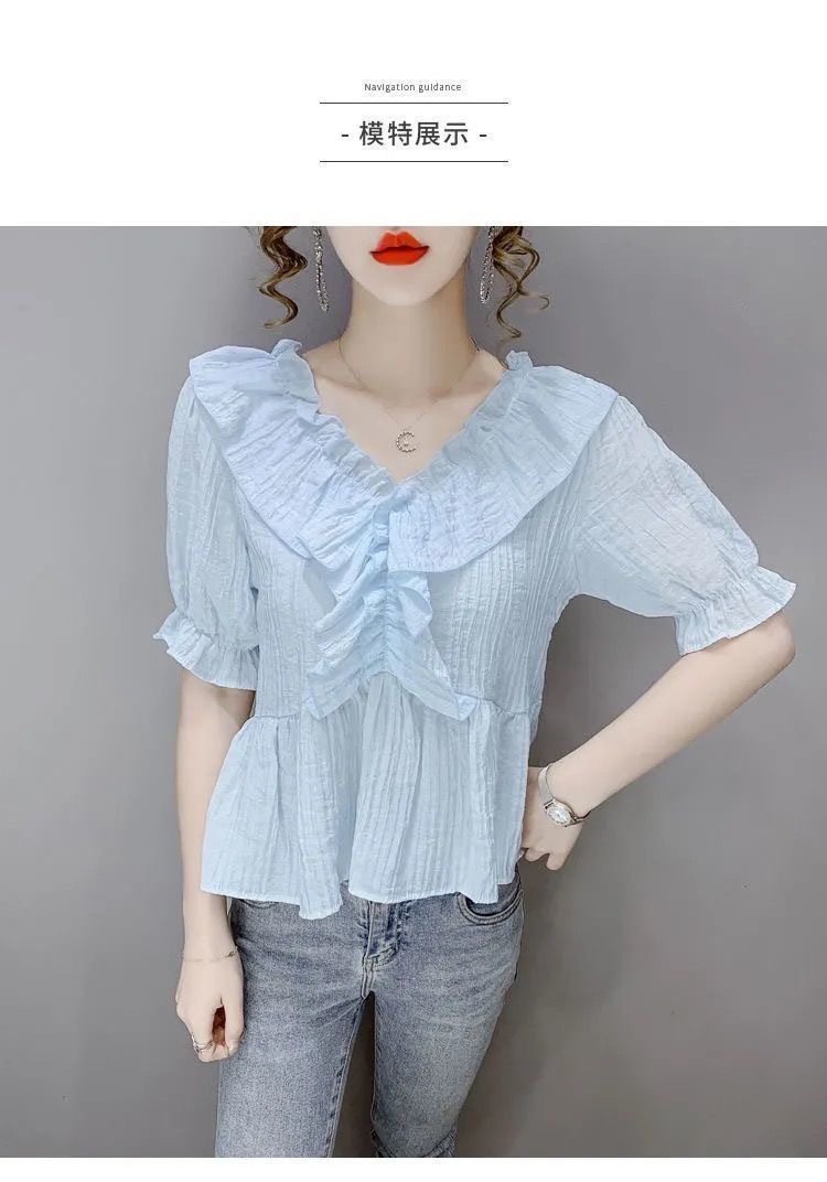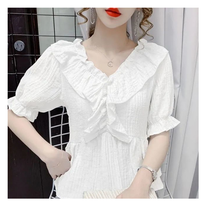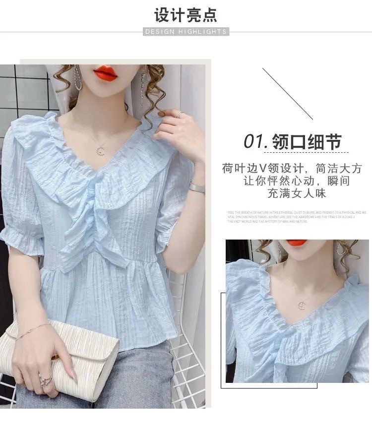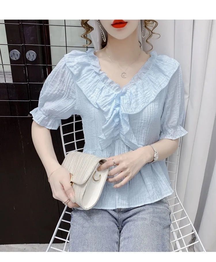 여름 새로운 프랑스어 v 넥 프릴 퍼프 반팔 셔츠 숙녀 다목적 패션 기질 탑 여성 티셔츠스토어 가기