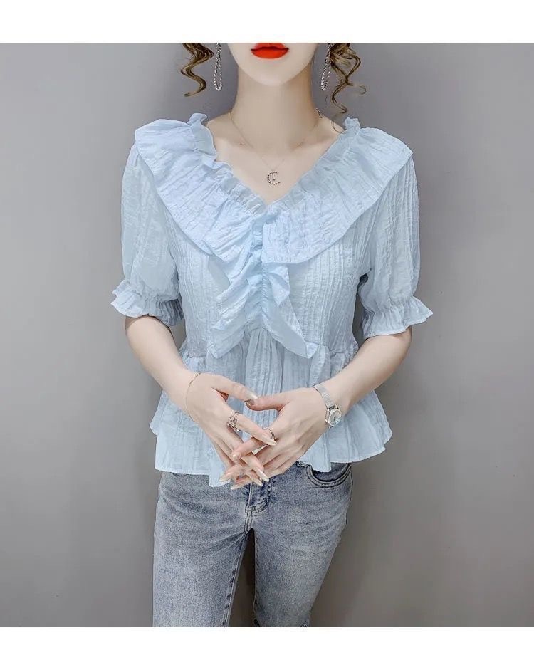 여름 새로운 프랑스어 v 넥 프릴 퍼프 반팔 셔츠 숙녀 다목적 패션 기질 탑 여성 티셔츠