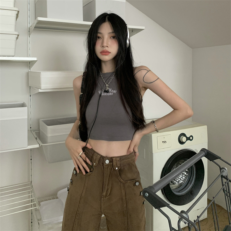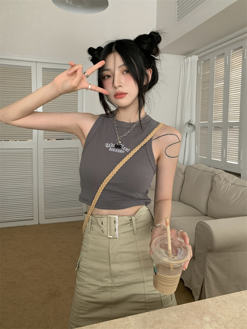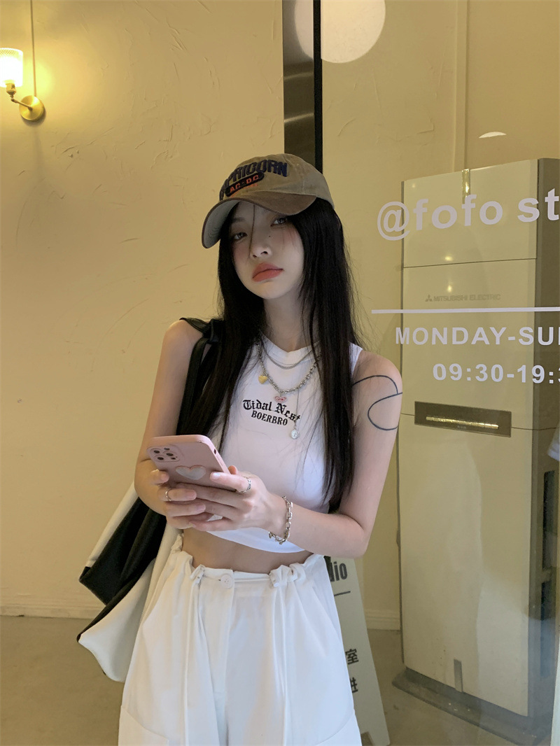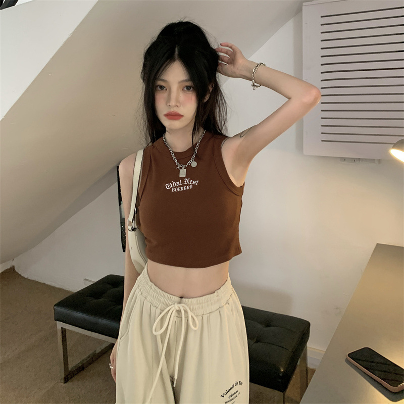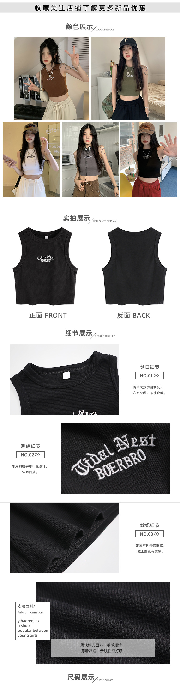 스파이스 걸스 착용 블랙 스포츠 자수 캐미솔 조끼 여자의 여름 짧은 니트베이스 민소매 짧은 탑스토어 가기