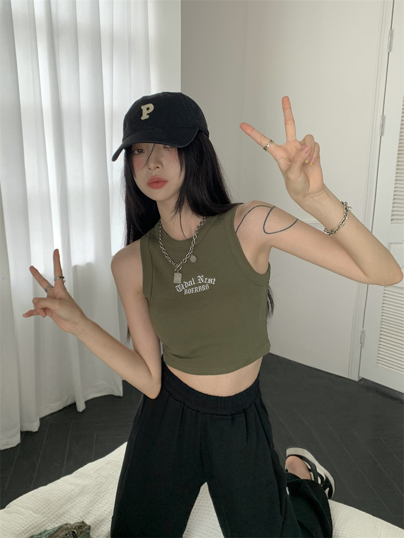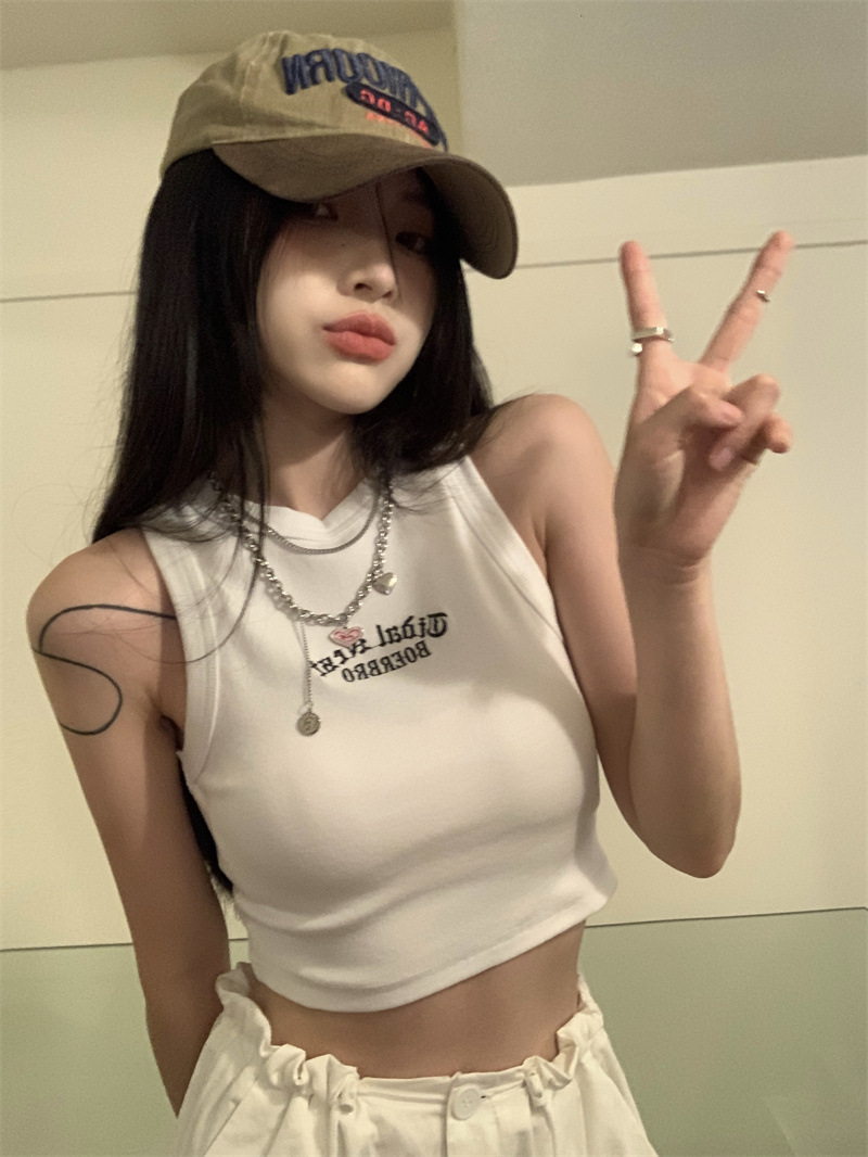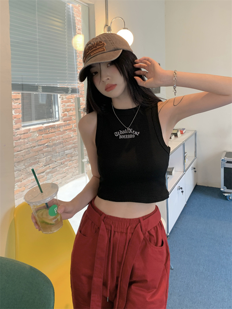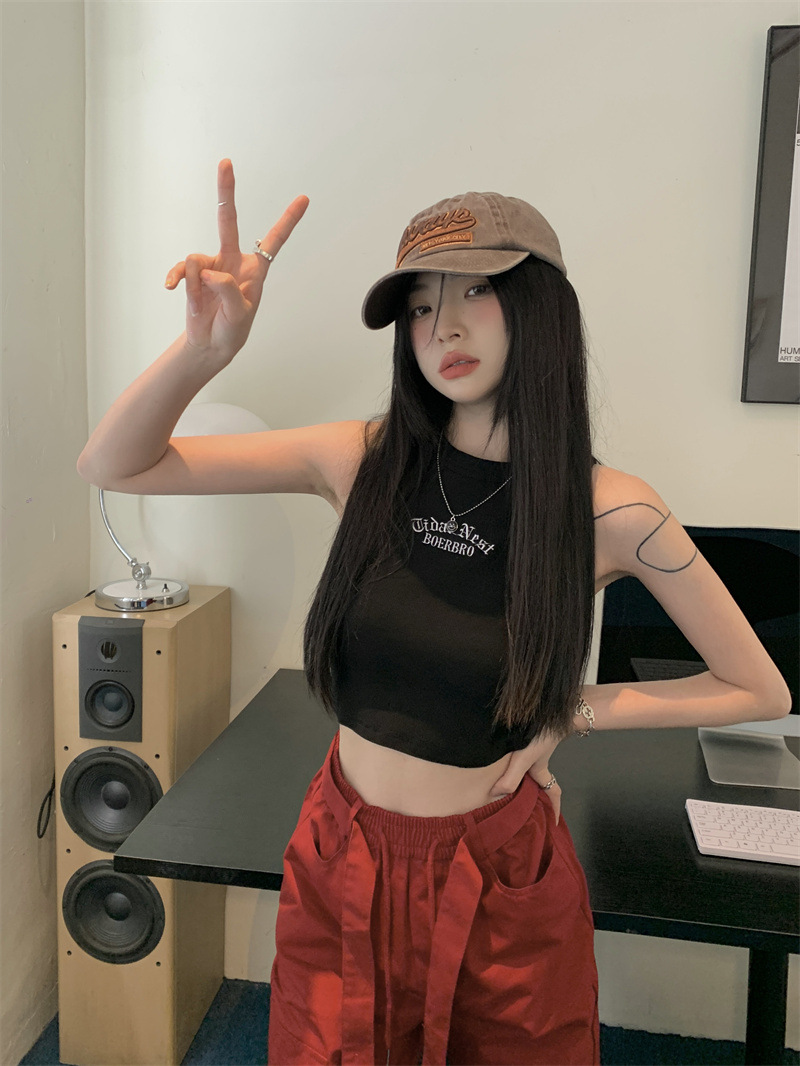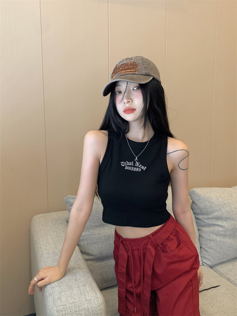 스파이스 걸스 착용 블랙 스포츠 자수 캐미솔 조끼 여자의 여름 짧은 니트베이스 민소매 짧은 탑