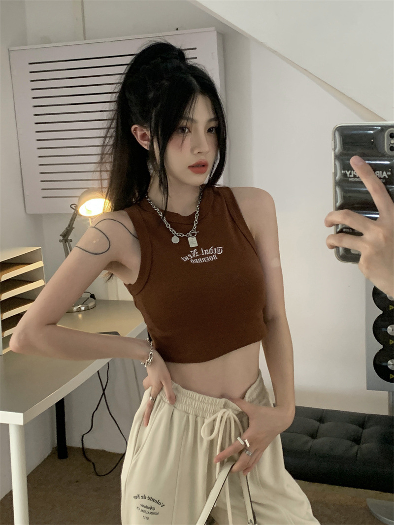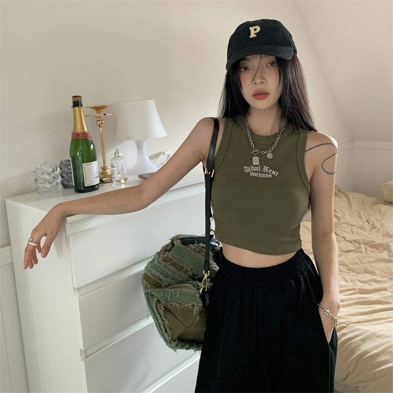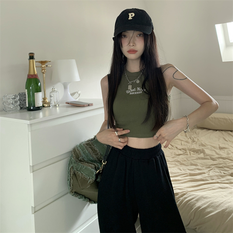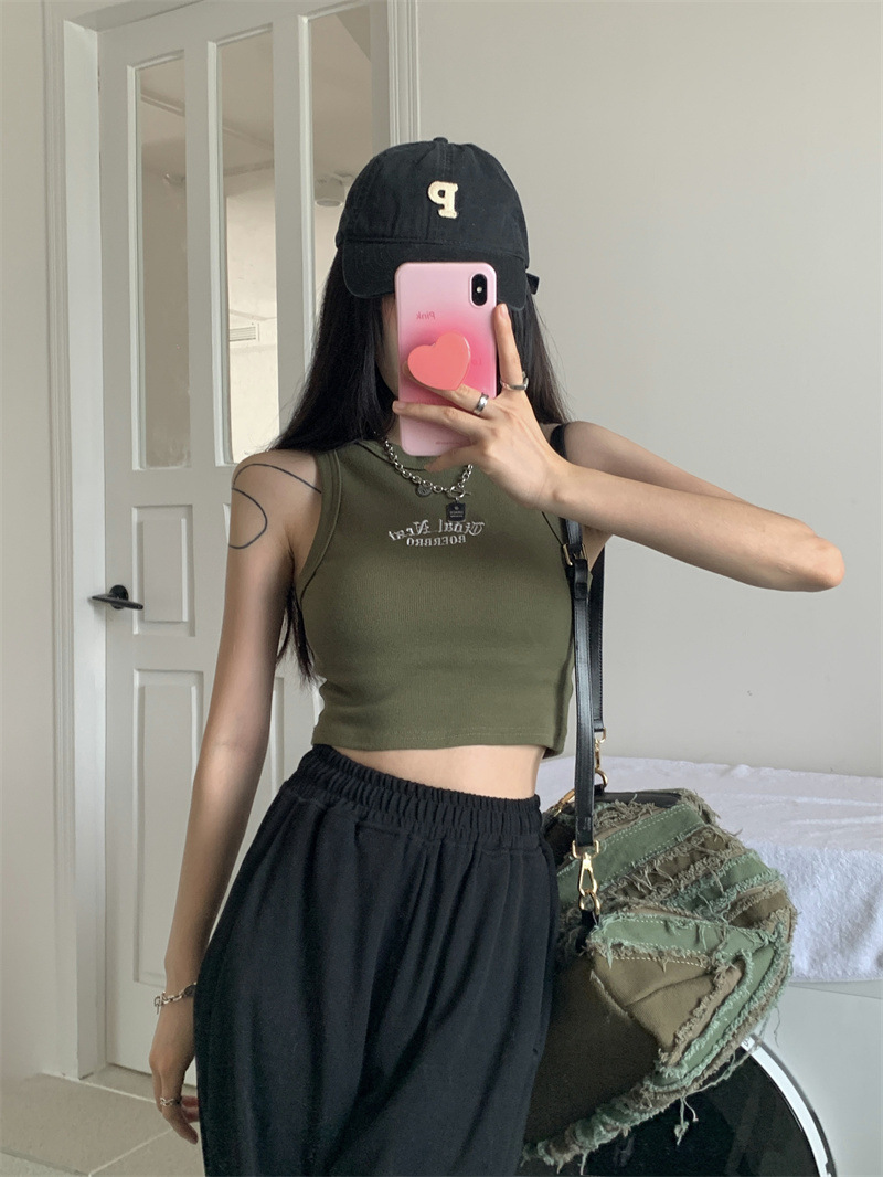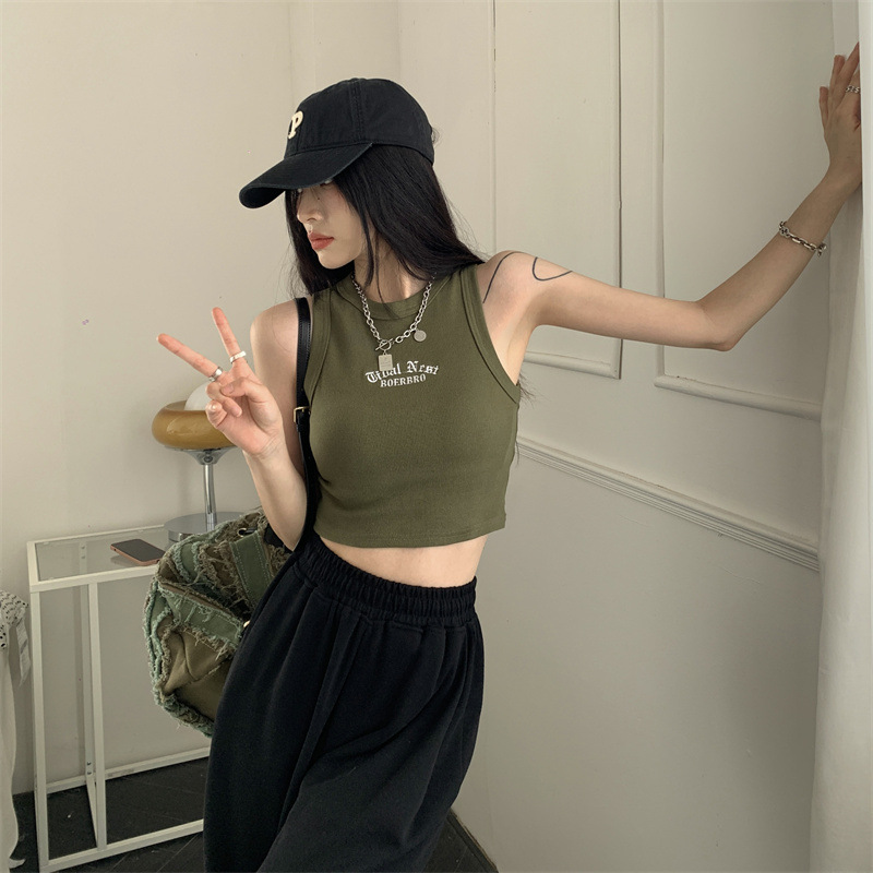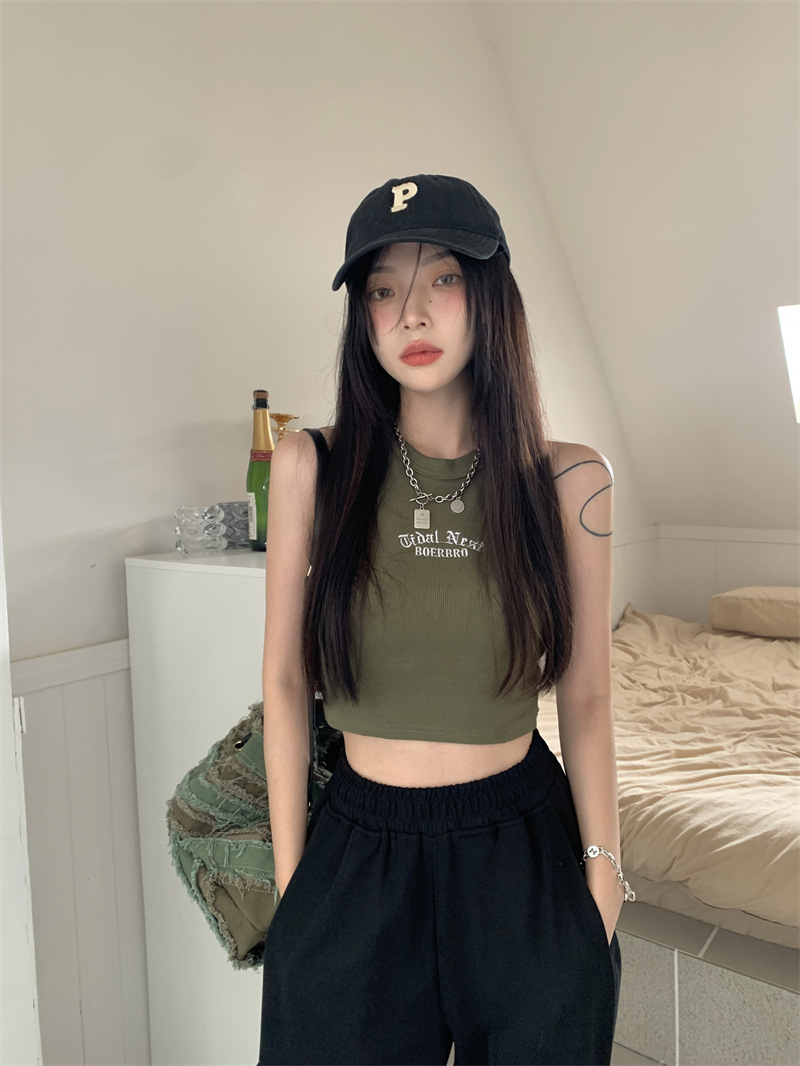 스파이스 걸스 착용 블랙 스포츠 자수 캐미솔 조끼 여자의 여름 짧은 니트베이스 민소매 짧은 탑