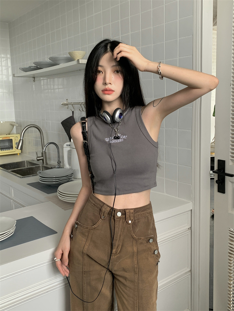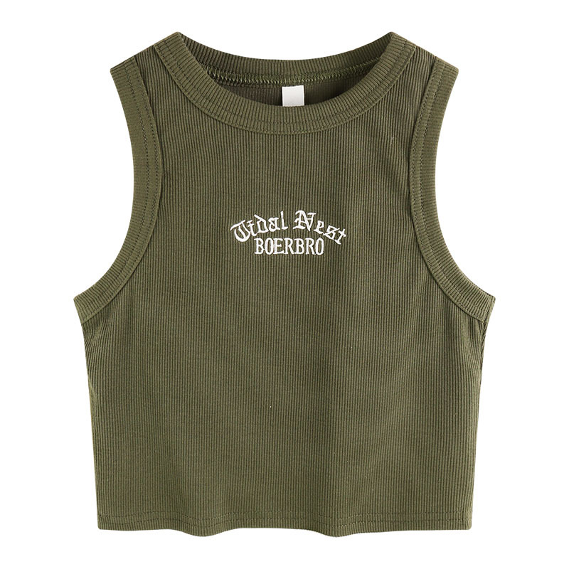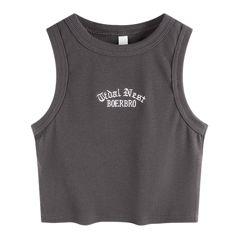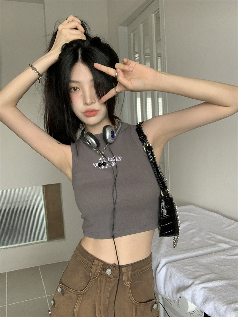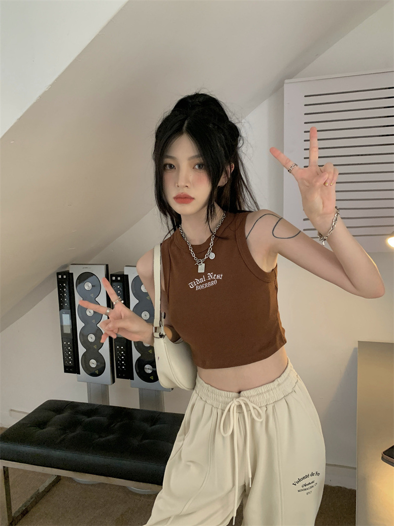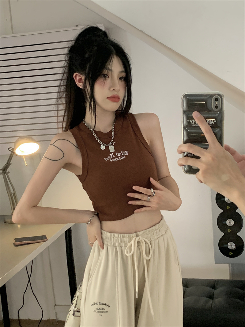 스파이스 걸스 착용 블랙 스포츠 자수 캐미솔 조끼 여자의 여름 짧은 니트베이스 민소매 짧은 탑