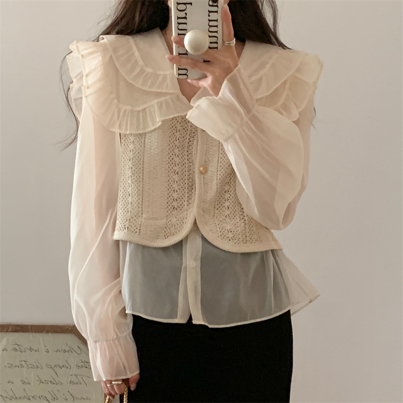 프랑스 달콤한 인형 칼라 셔츠 여성용 가짜 투피스 긴팔 2023 봄과 가을 새로운 우아한 시크 한국 스타일 여성용 탑