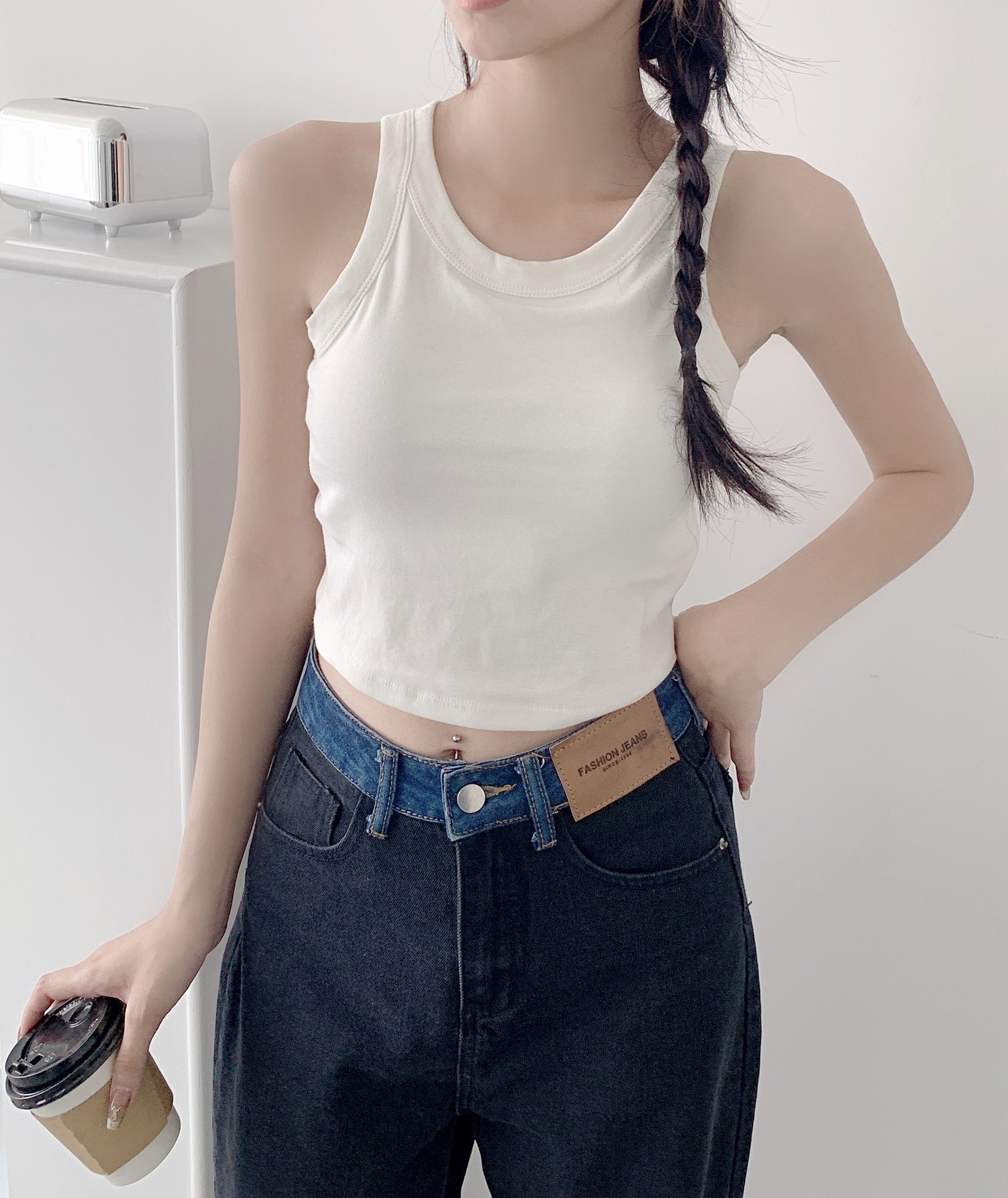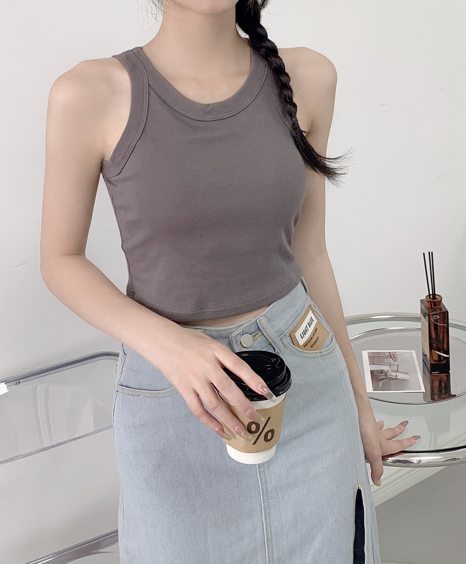 솔리드 컬러 심플 I 자형 아름다운 백 캐미솔 (가슴 패드 포함) 여성용 원피스 아우터 착용 내부 민소매 쇼트 탑 여성용스토어 가기