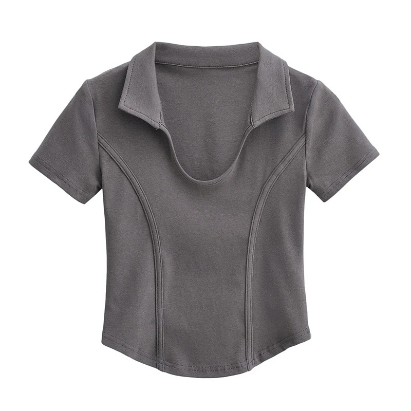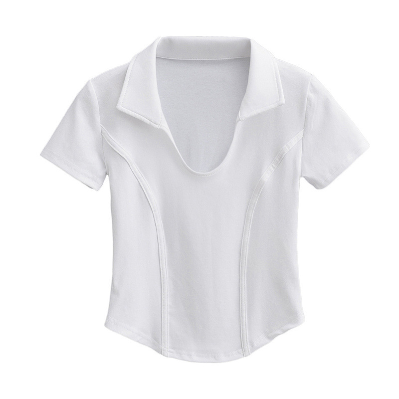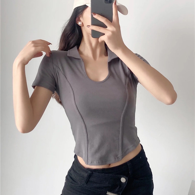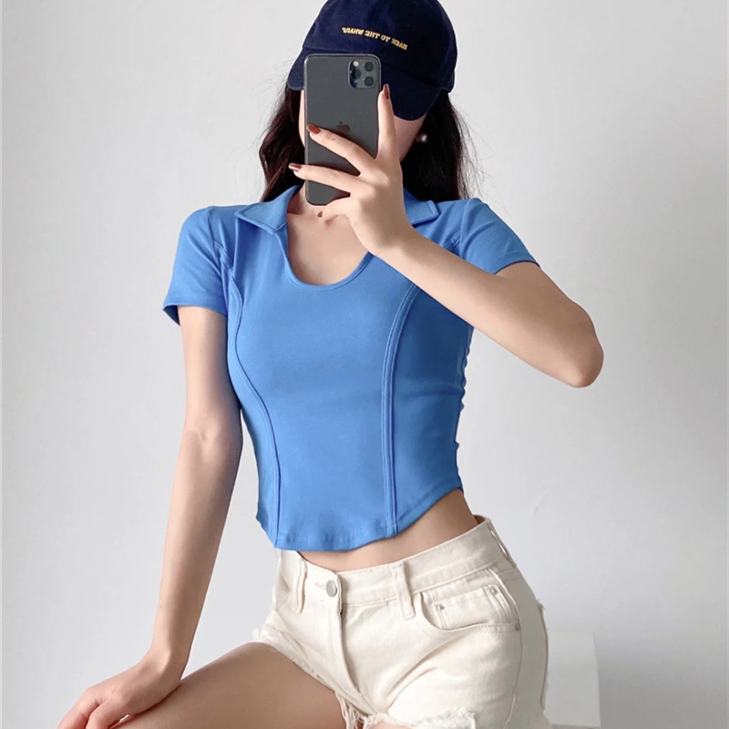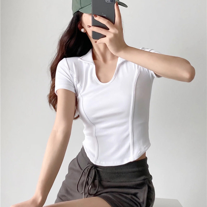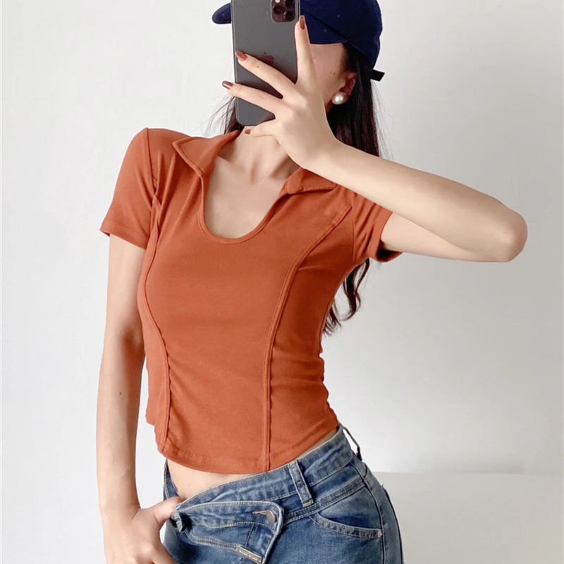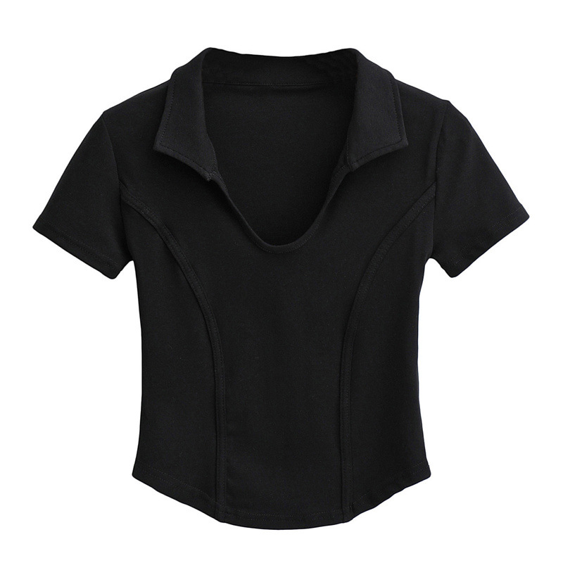 디자인 감각 물고기 뼈 스티커 옷깃 곡선 밑단 반소매 티셔츠 여름 슬림 봐 짧은 뜨거운 소녀 최고 여성스토어 가기