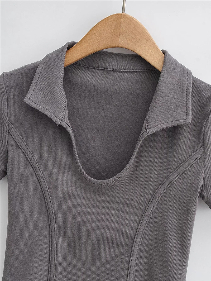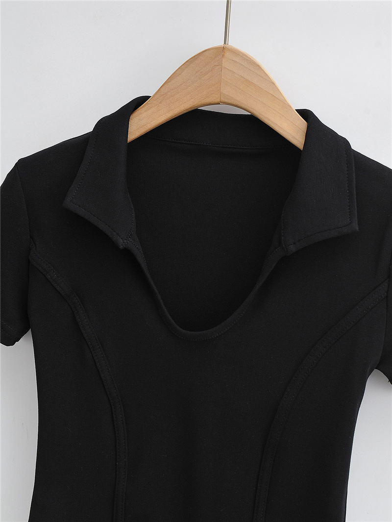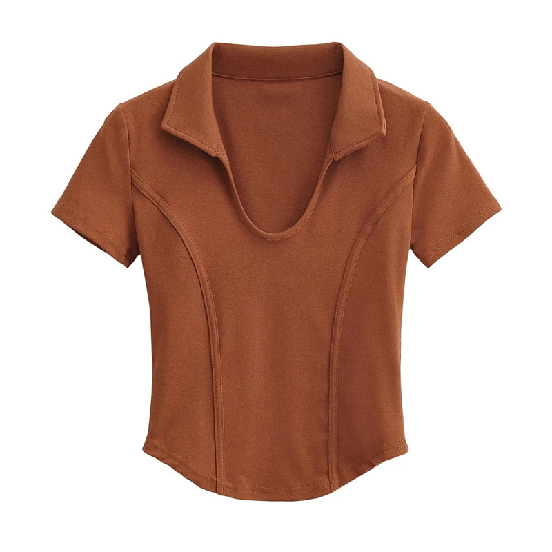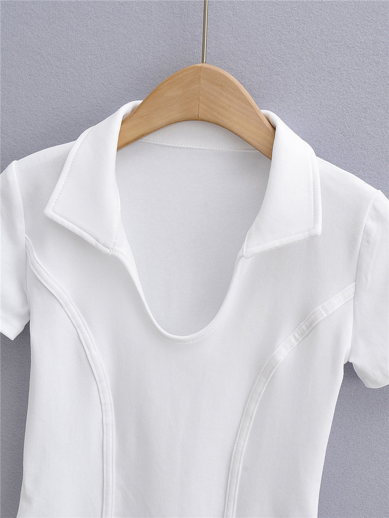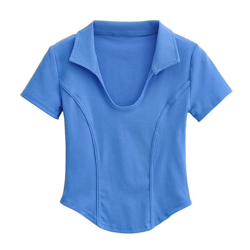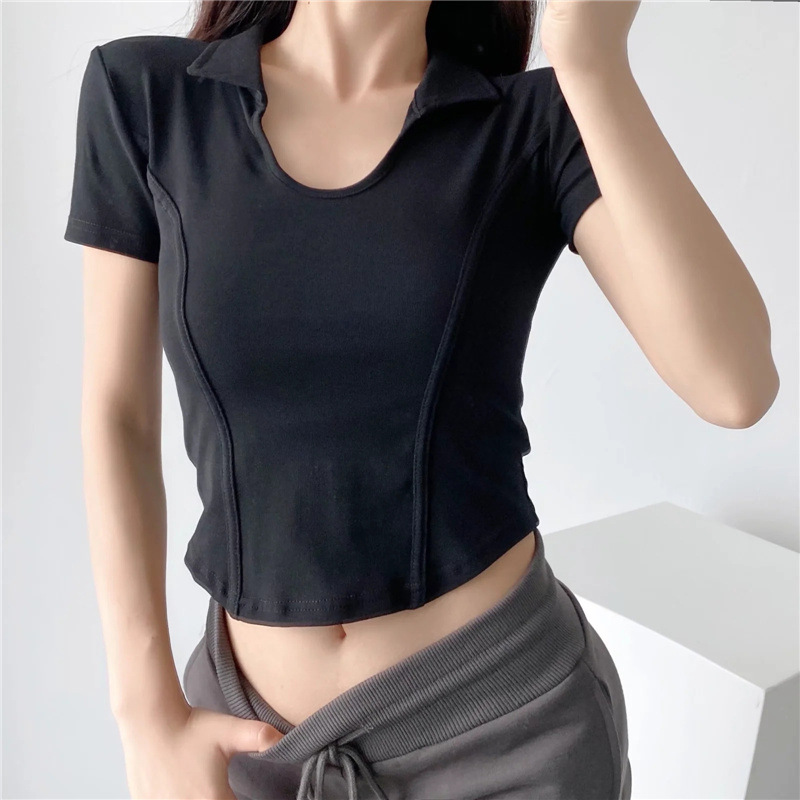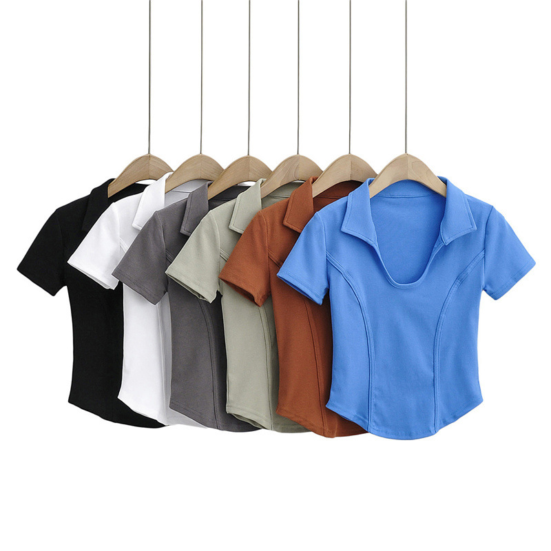 디자인 감각 물고기 뼈 스티커 옷깃 곡선 밑단 반소매 티셔츠 여름 슬림 봐 짧은 뜨거운 소녀 최고 여성스토어 가기