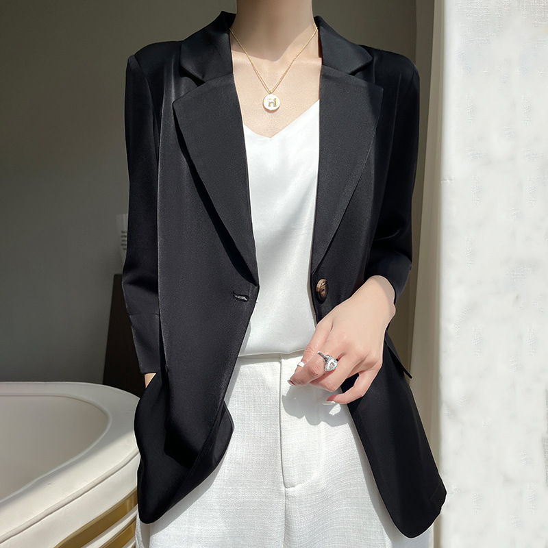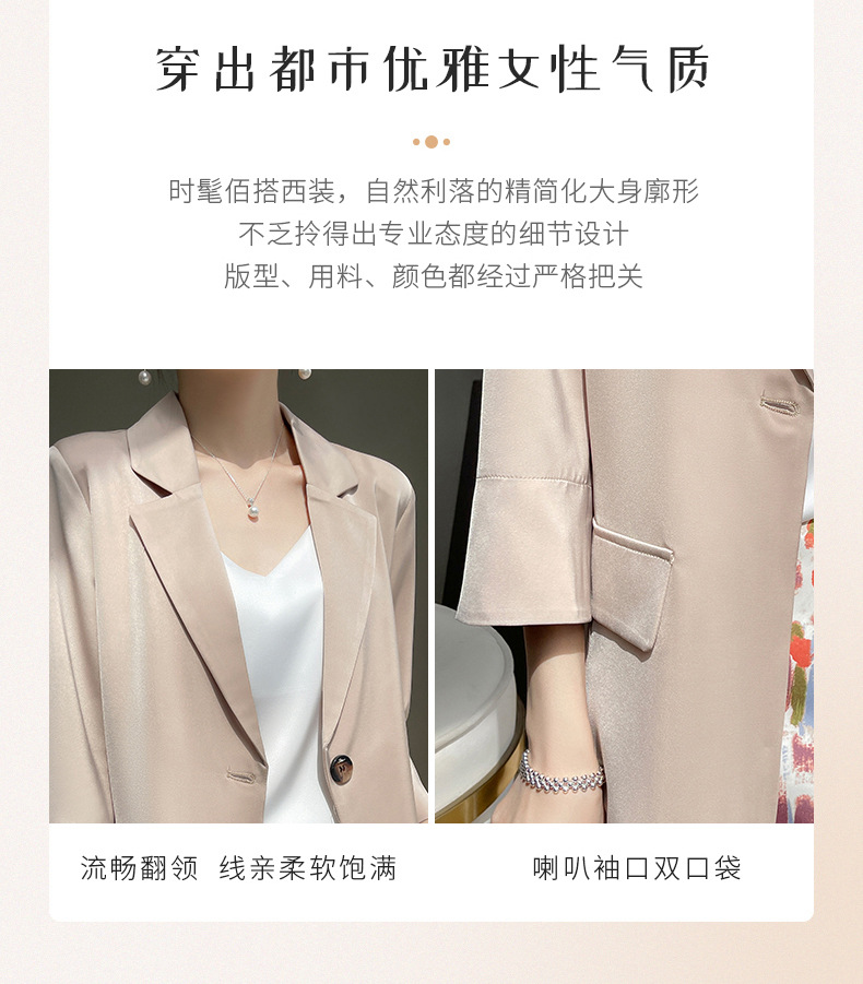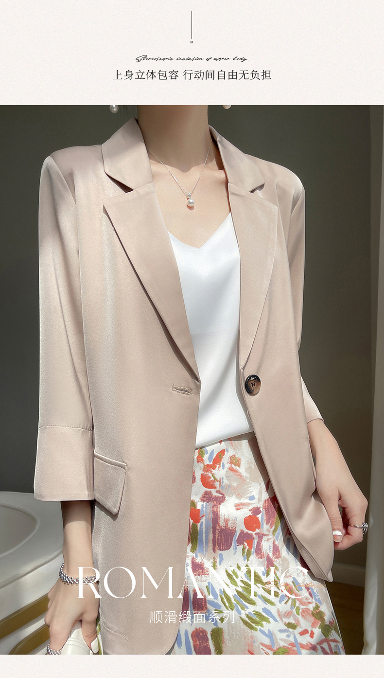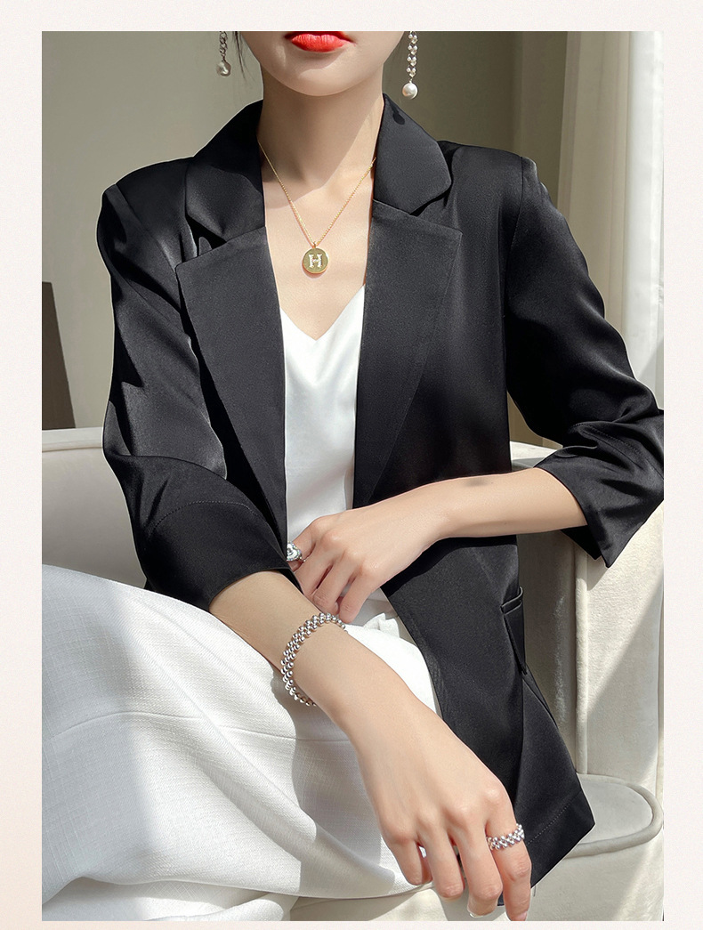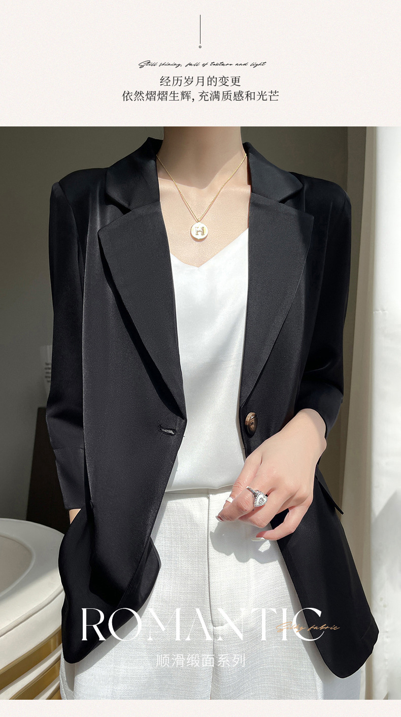 통근 스타일 작은 세트 여자의 여름 얇은 비즈니스 세트 최고 새틴 아세테이트 7 소매 슬림 핏 재킷