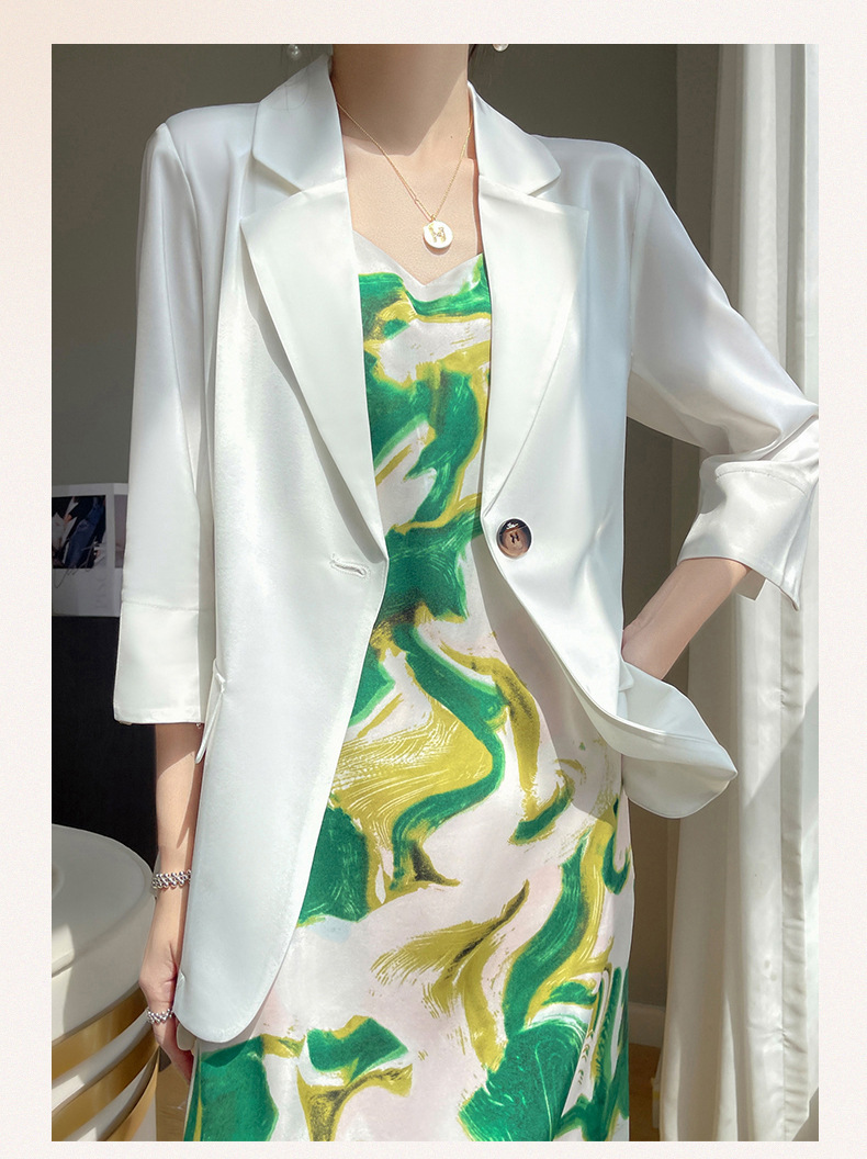 통근 스타일 작은 세트 여자의 여름 얇은 비즈니스 세트 최고 새틴 아세테이트 7 소매 슬림 핏 재킷스토어 가기