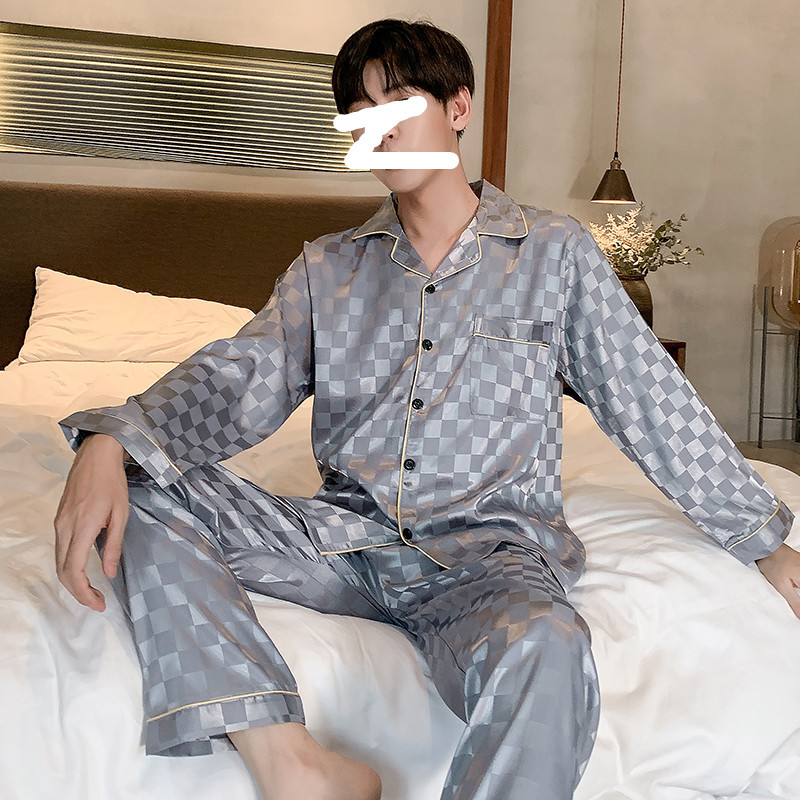 7XL 뚱뚱한 남자 300kg 남자 잠옷 여름 격자 무늬 긴 소매 아이스 실크 플러스 지방 플러스 사이즈 200kg 가정 옷 봄과 가을