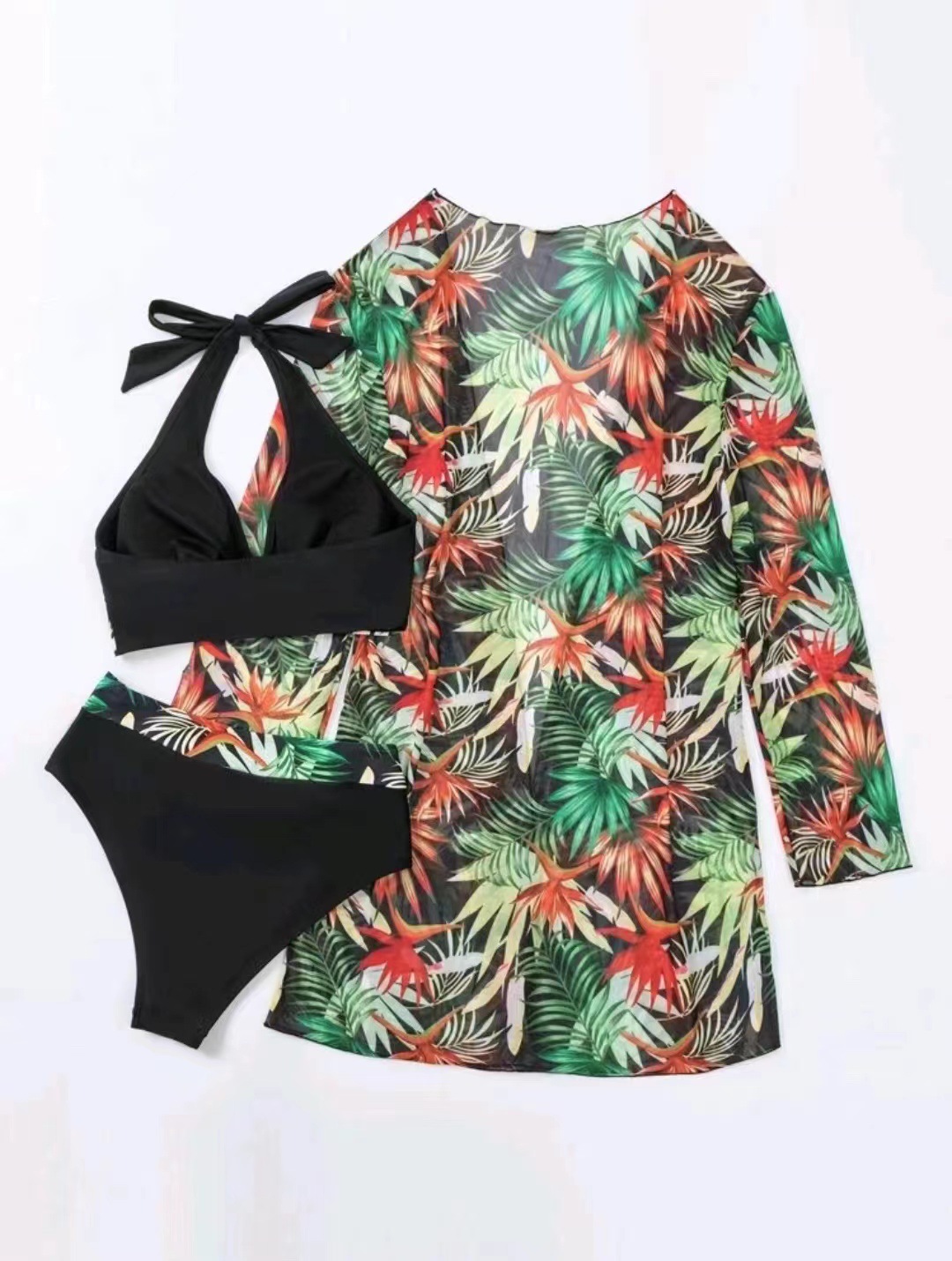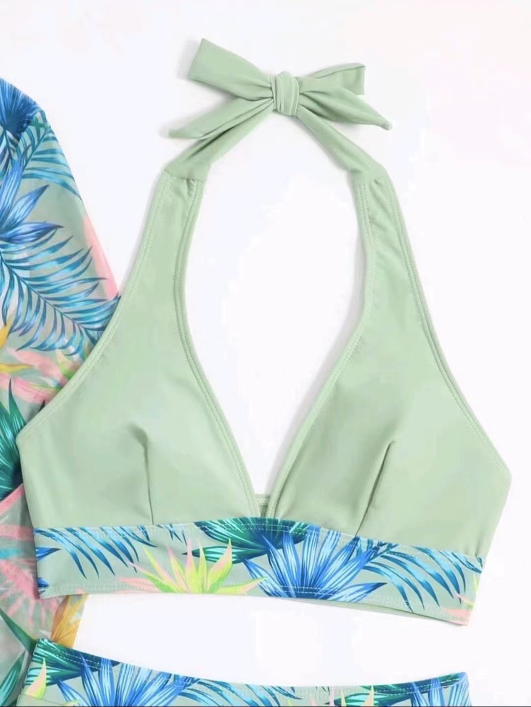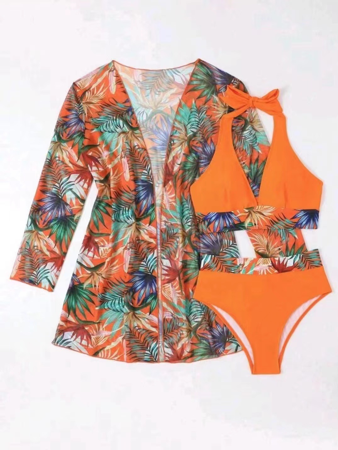 2023 크로스 보더 유럽과 미국 섹시 블라우스 메쉬 비키니 3 피스 비키니 여성용 푸시 업 스플릿 프린트 수영복