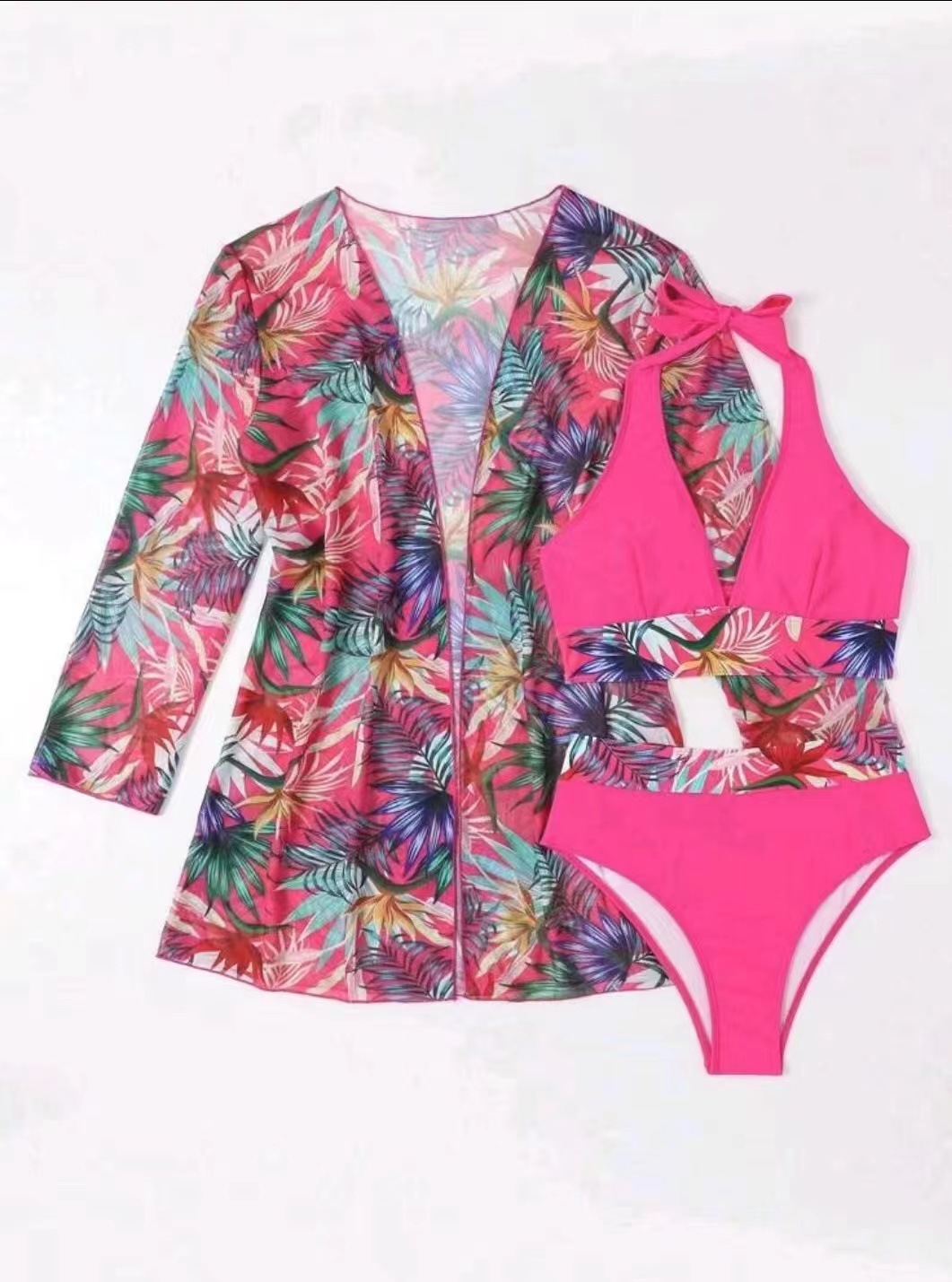 2023 크로스 보더 유럽과 미국 섹시 블라우스 메쉬 비키니 3 피스 비키니 여성용 푸시 업 스플릿 프린트 수영복스토어 가기