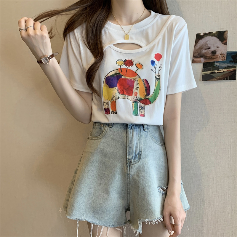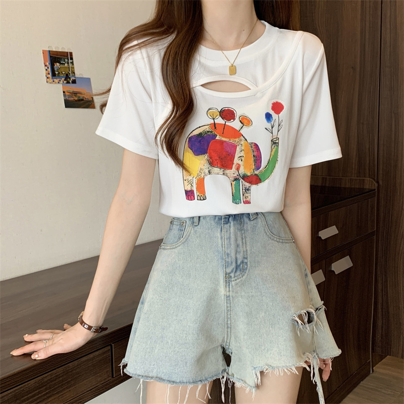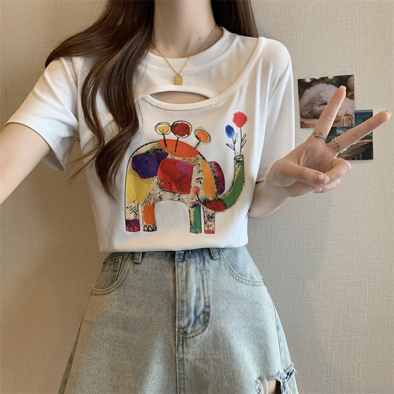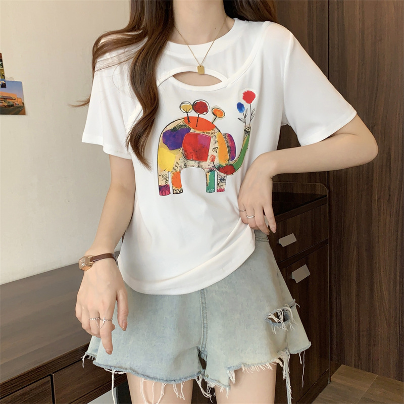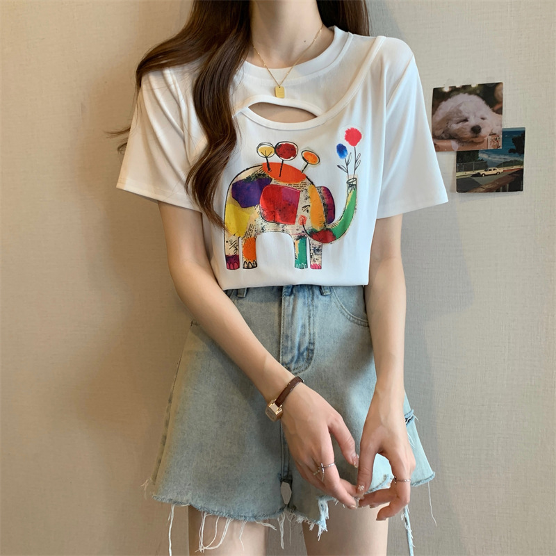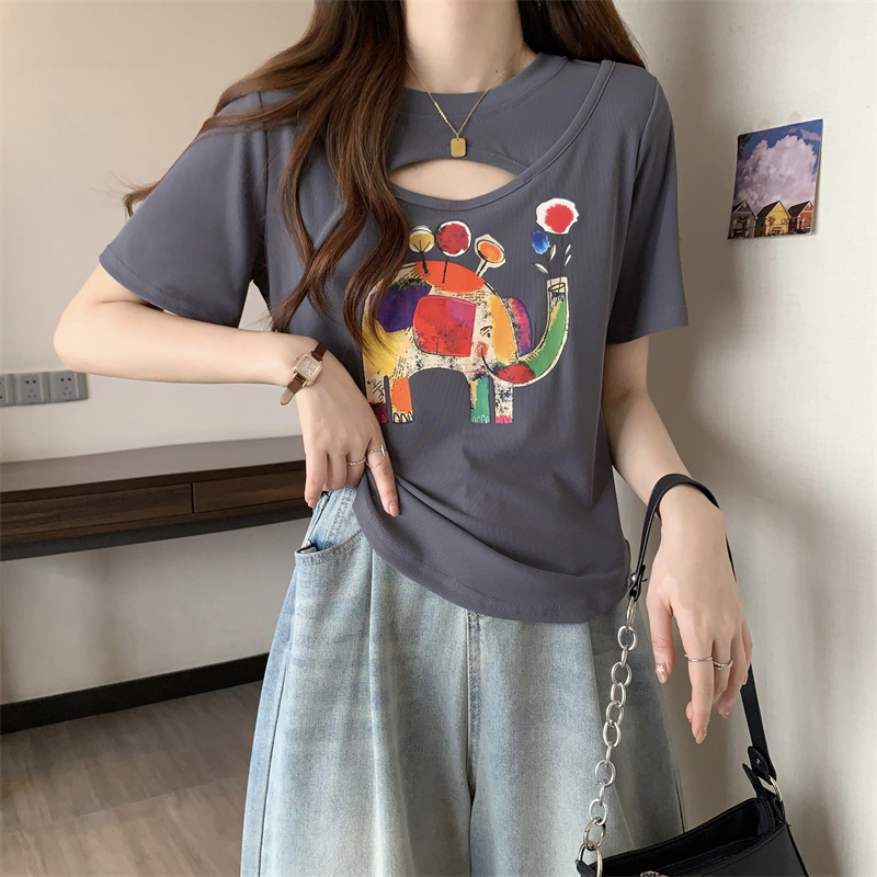 플러스 사이즈 여자의 여름 새로운 반팔 티셔츠 여자의 어깨 프랑스 스타일 통통녀 배꼽 커버 슬리밍 시크 틈새 탑스토어 가기