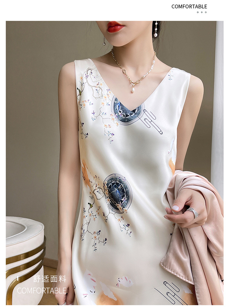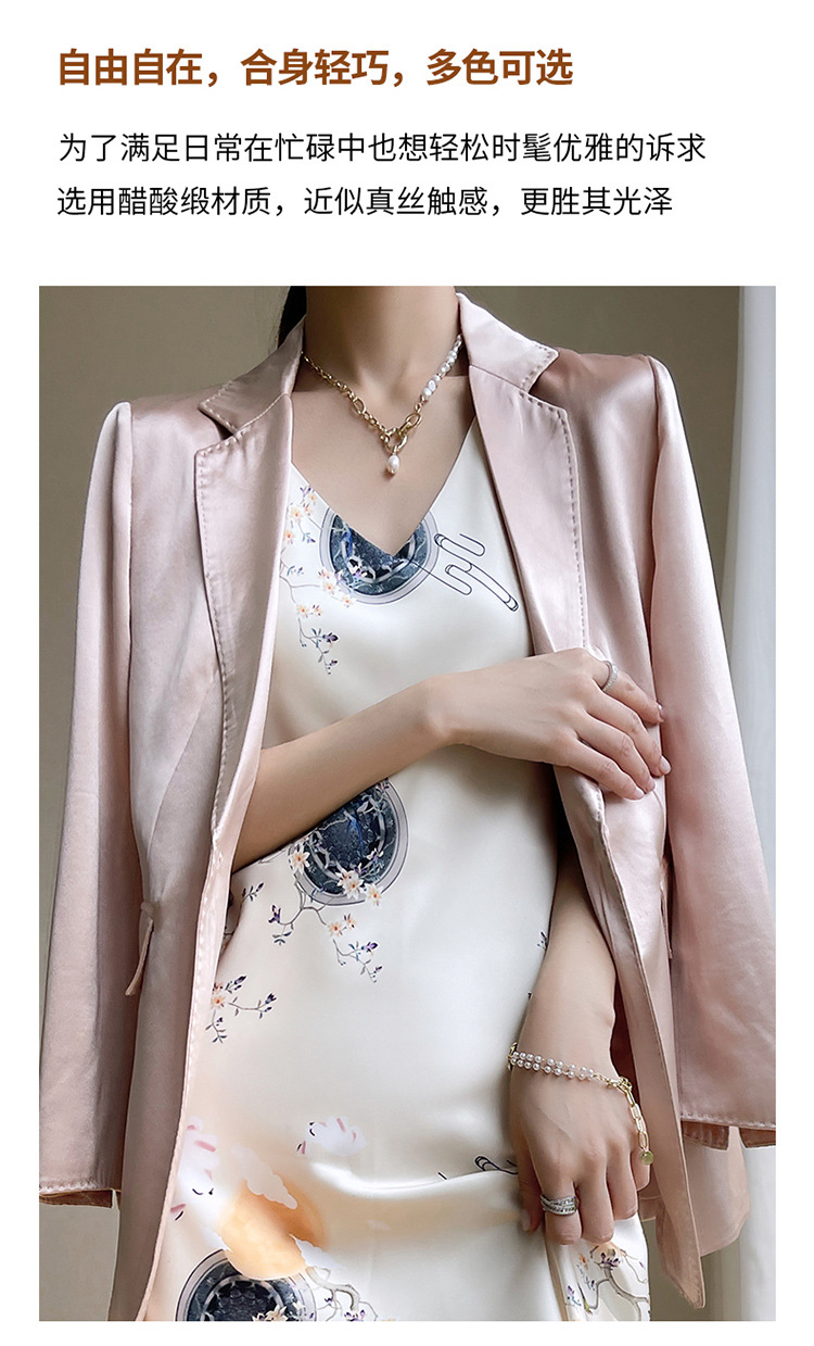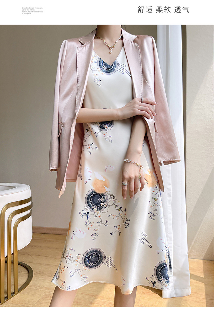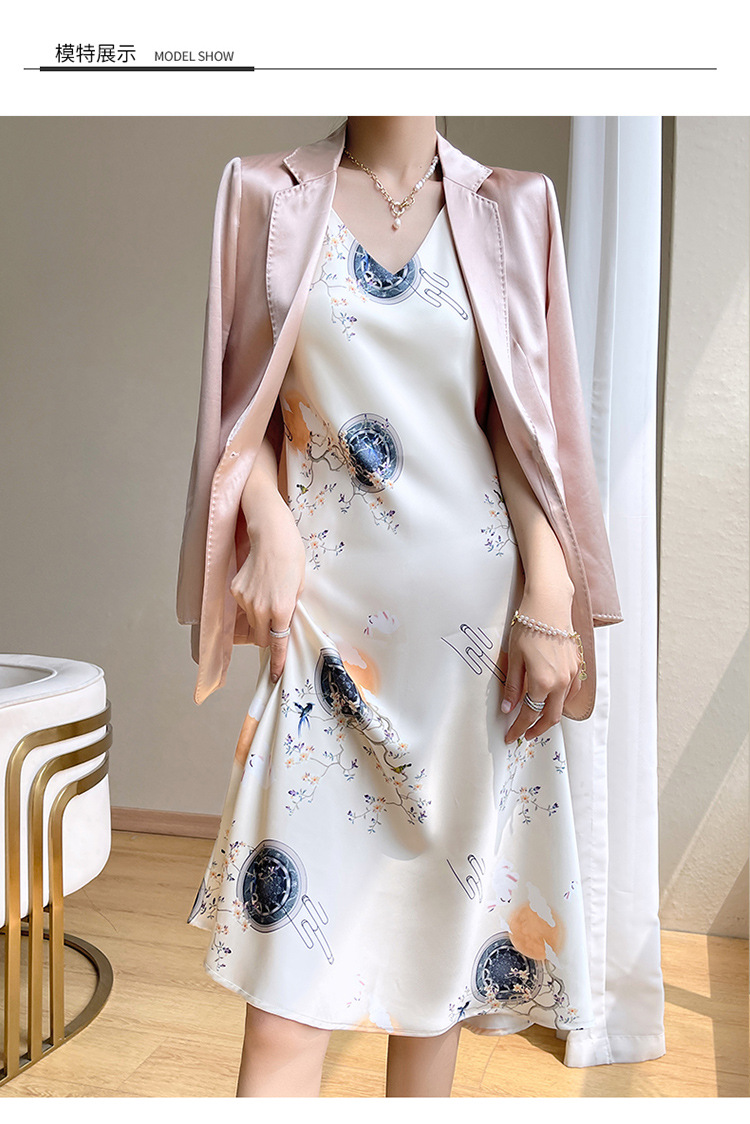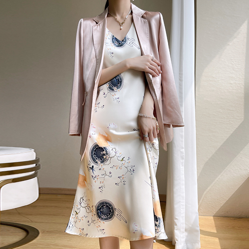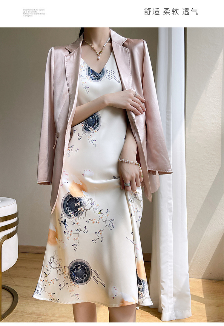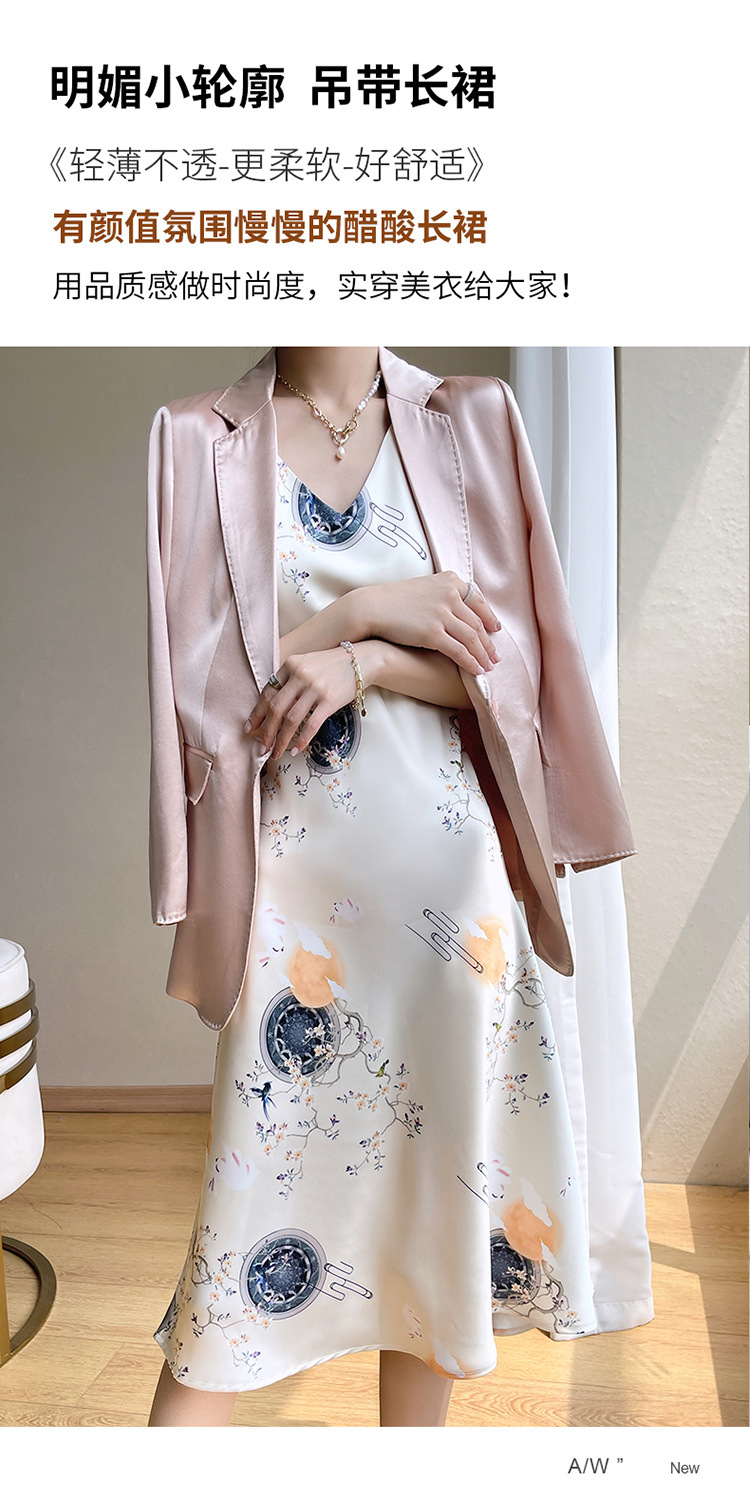 아세트산 새틴 슬링 원피스 여자의 프랑스 스타일 와이드 숄더 V-넥 A-라인 질감 하이 웨이스트 여름 인테리어 인쇄 슬링 원피스스토어 가기