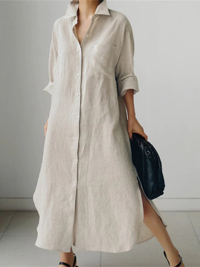 2025 유럽과 미국의 국경 뉴면 및 리넨 셔츠 원피스 느슨한 불규칙한 기지 셔츠 카디건 긴 원피스