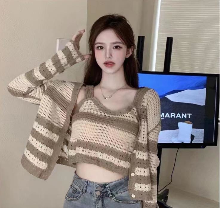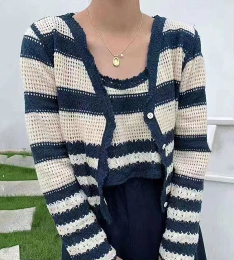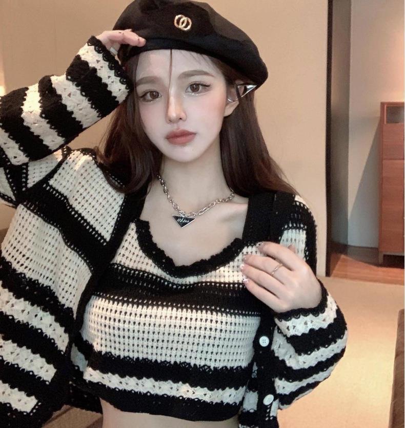 흑백 스트라이프 여성용 니트 가디건 투피스 재킷 + 조끼 여성용 짧은 긴팔 시크 세트 탑