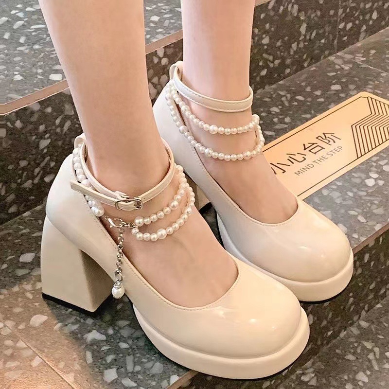 블랙 샤넬 스타일 싱글 레이어 슈즈 여성용 2023 새로운 패션 모든 매치 웨스턴 스타일 펄 하이힐 미끄럼 방지 메리 제인 신발 트렌디스토어 가기