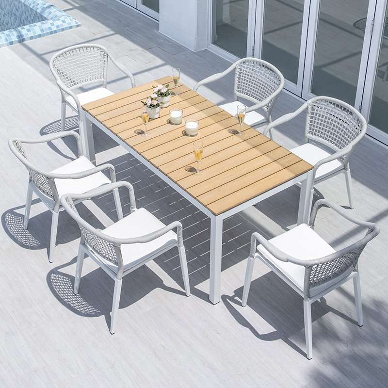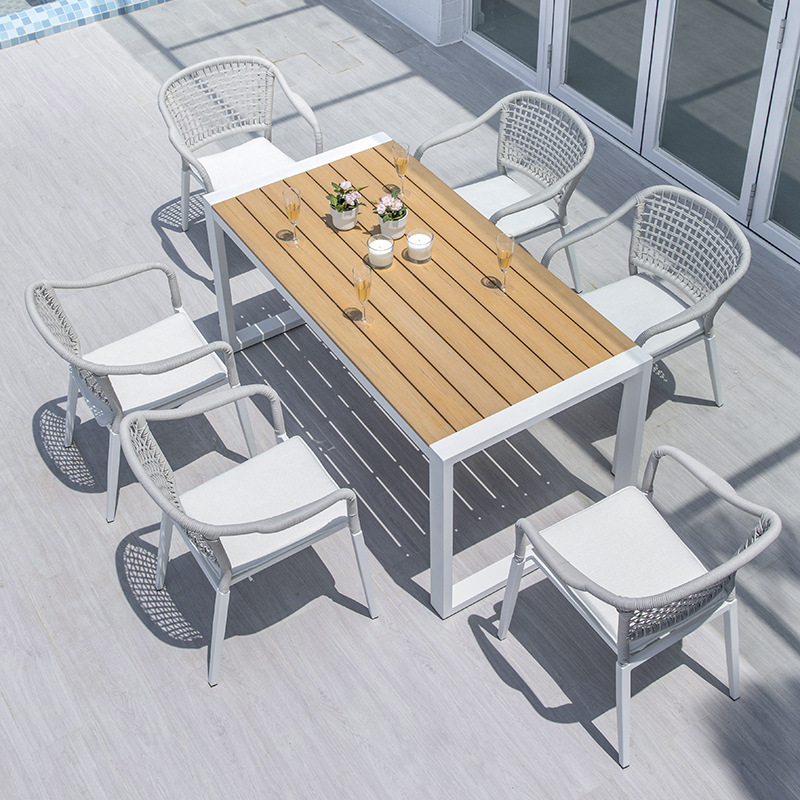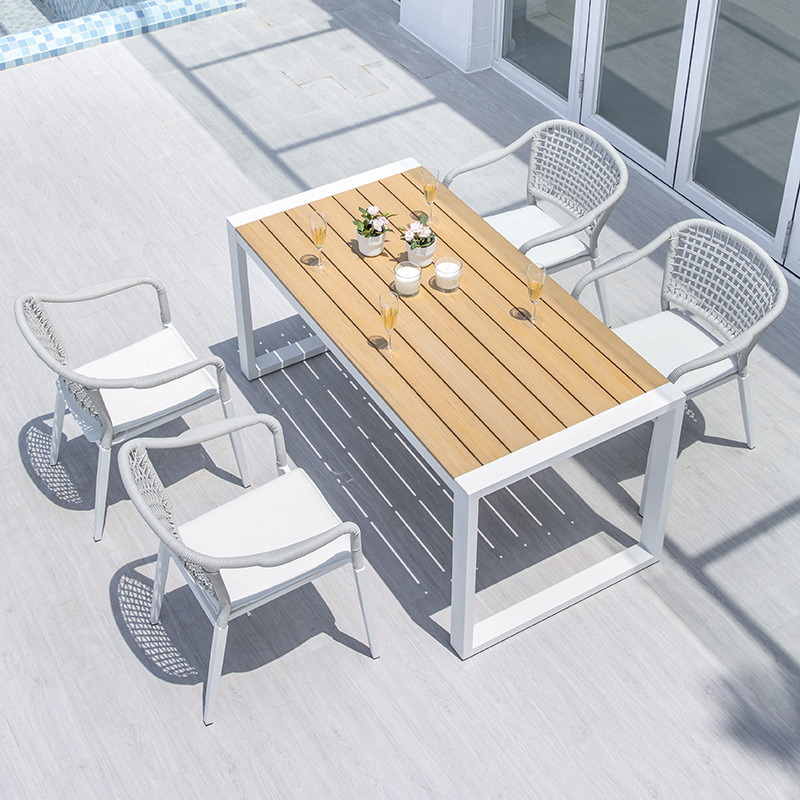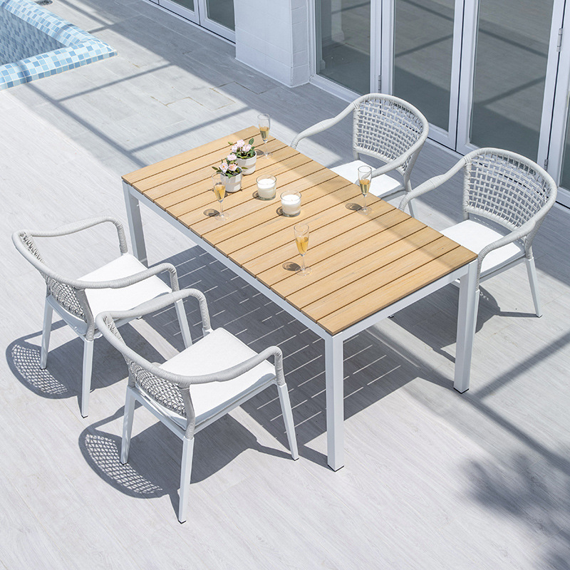 야외 플라스틱 나무 테이블과 의자 안뜰 야외 빌라 부식 방지 목재 레저 식탁 가정용 등나무 의자 등나무 의자 세트 북유럽
