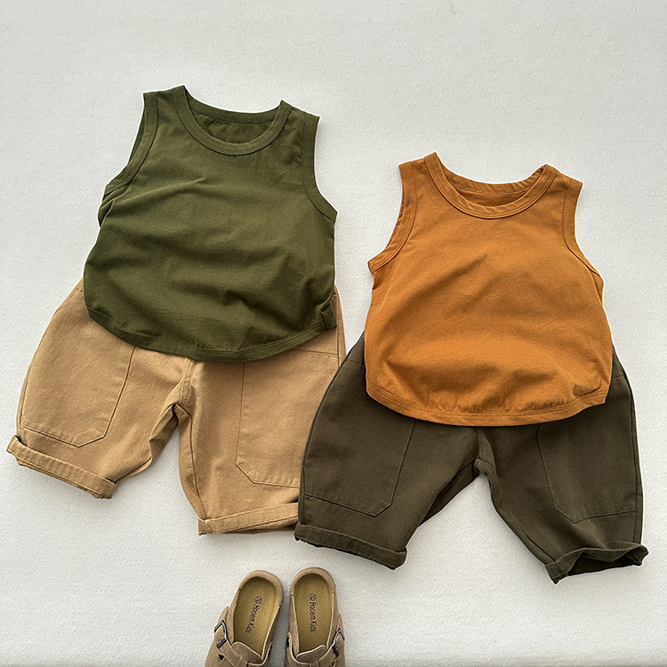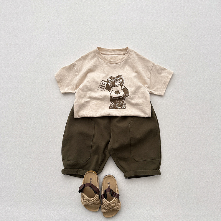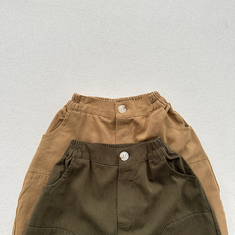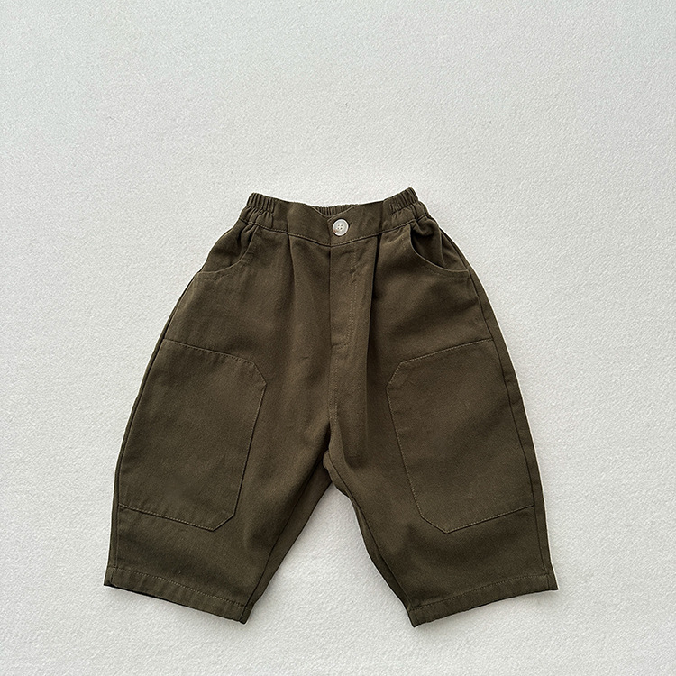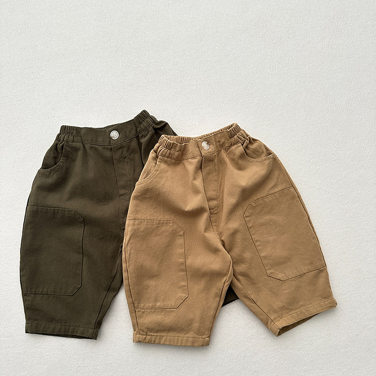 어린이 한국식 바지 봄과 여름 새로운 소년 소녀 프레스 라인 무 바지 워시 빈티지 패치 크롭 캐주얼 바지