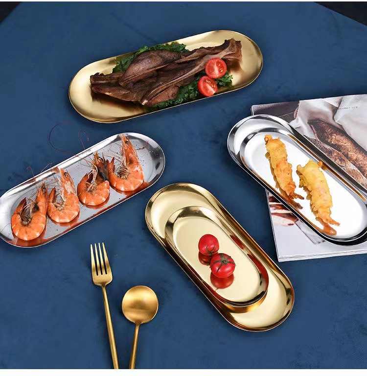 서양 레스토랑의 스테인레스 스틸 타원형 접시 초대형 디저트 과자 접시 장식 황금 트레이 한국 요리 접시스토어 가기