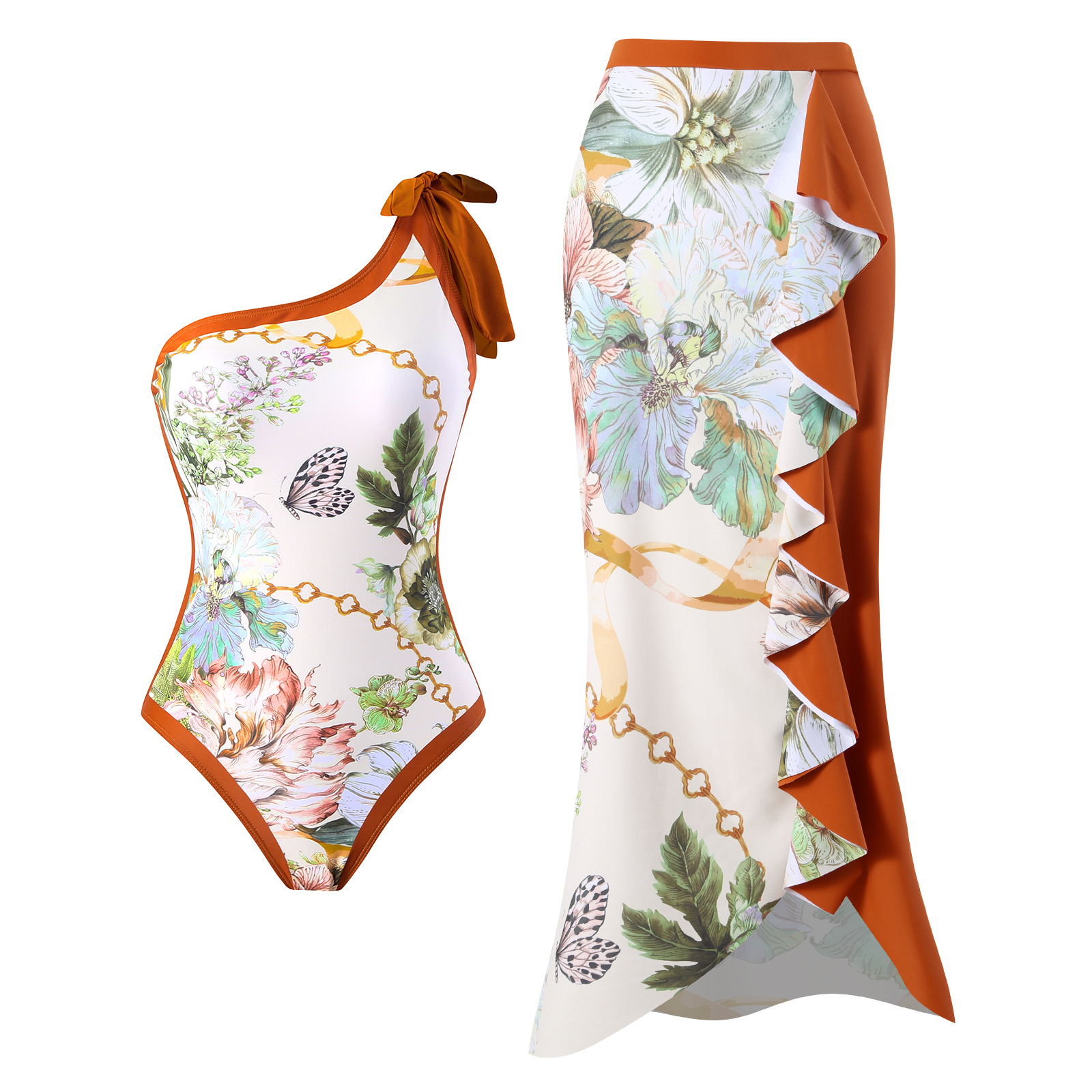 2025现货欧美性感连体泳衣拼色印花两件套涤纶裙热卖爆款泳装套装