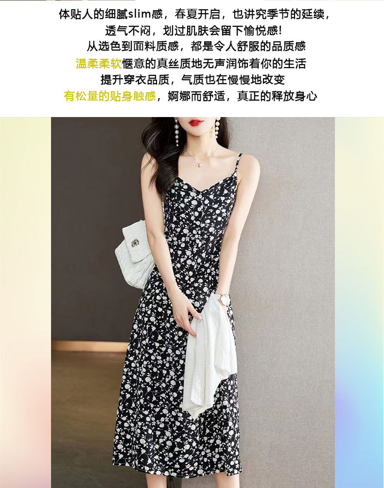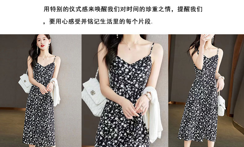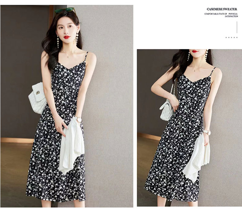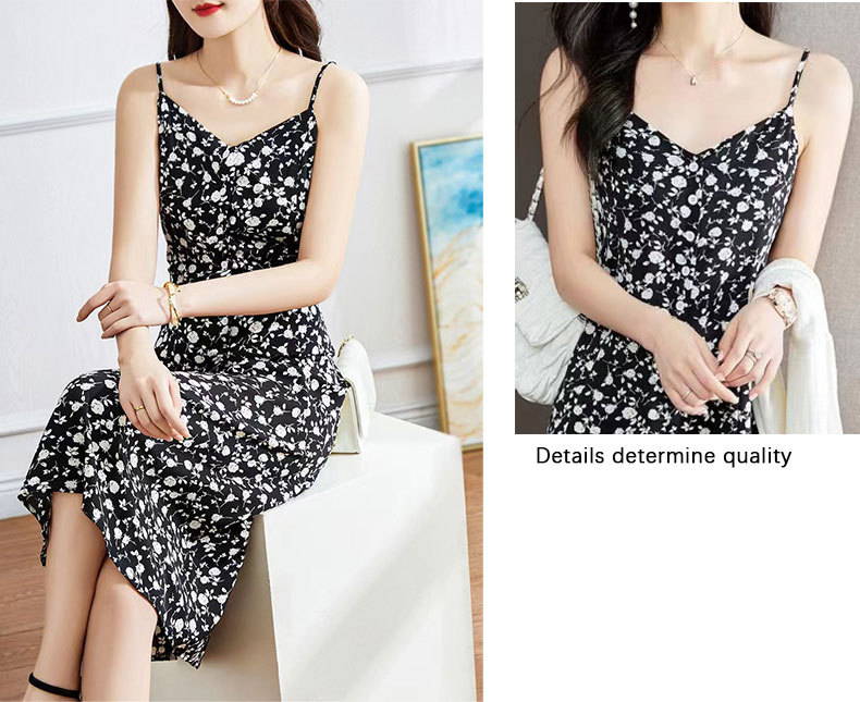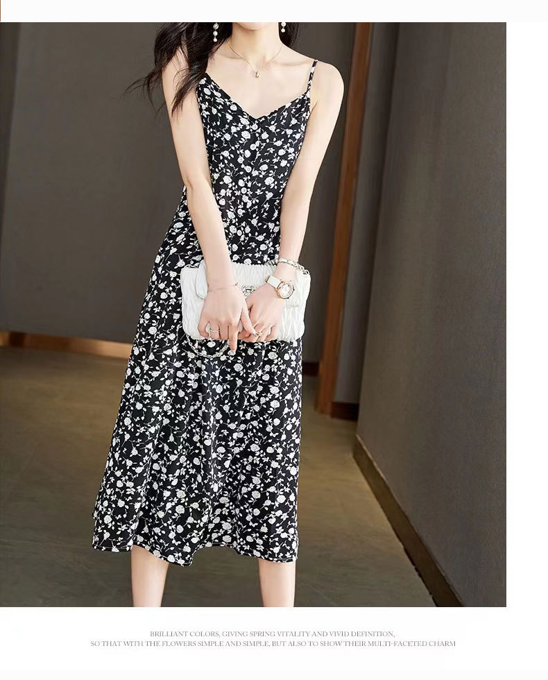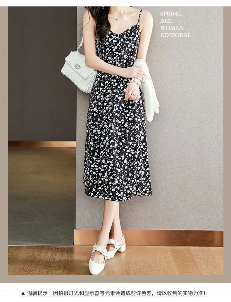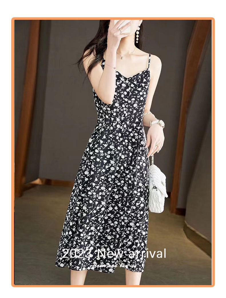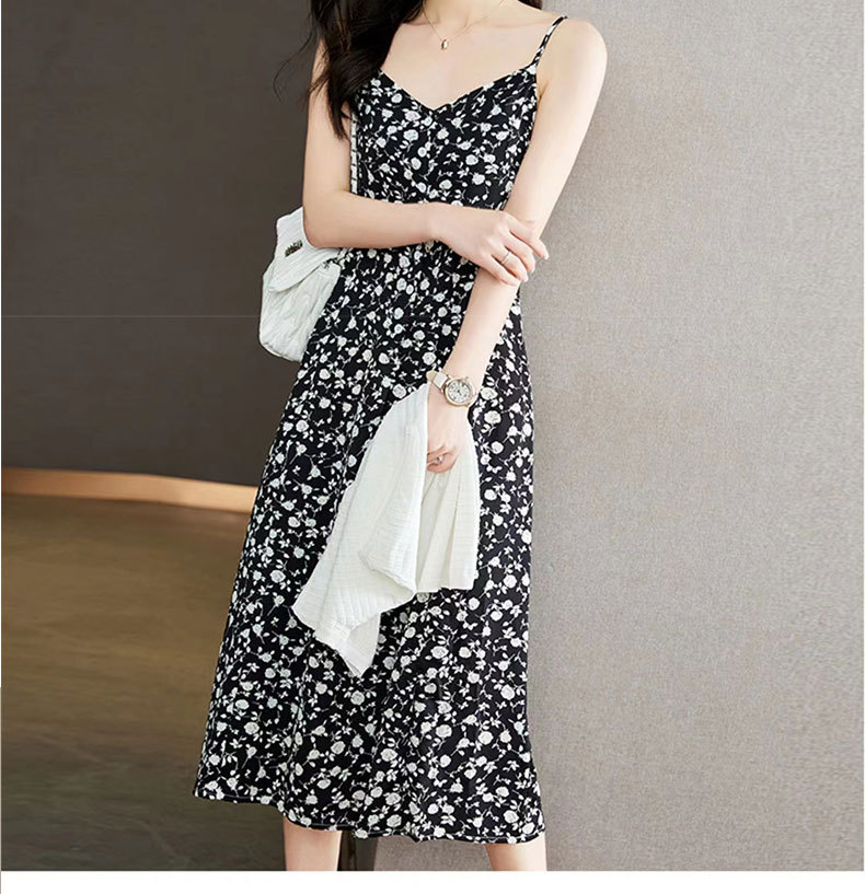2023 여름 신상품 스트랩 꽃무늬 쉬폰 얇은 블랙 원피스 라이트 성숙한 스타일 슬리밍 드레이프 원피스 여성 트렌디스토어 가기