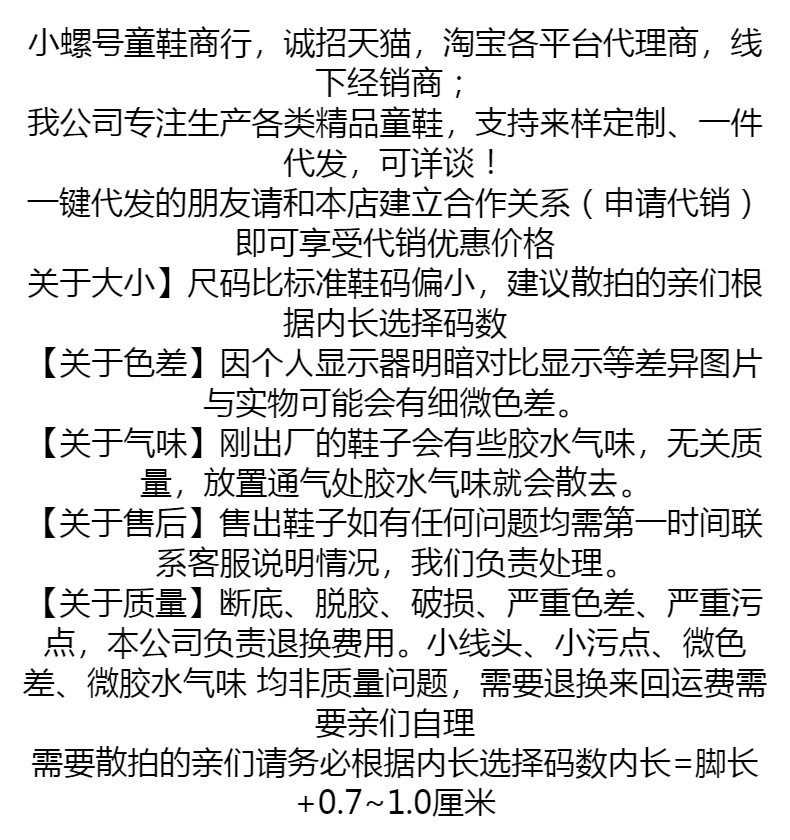 尺码偏小 请参照内长内长选择码数 内长=脚长+0.7~1厘米 脚胖脚宽脚背高的宝宝请亲们适当再加大点拍