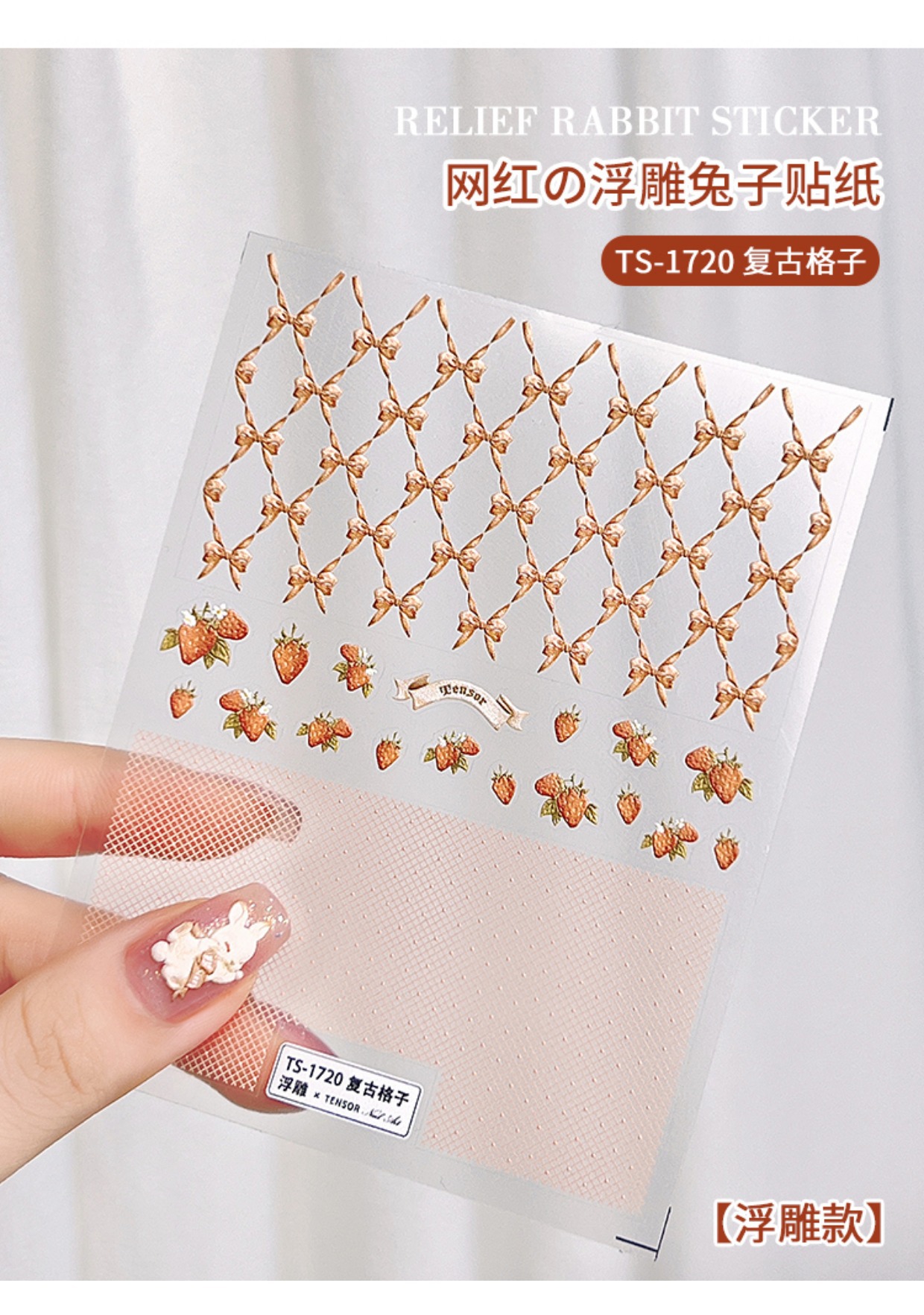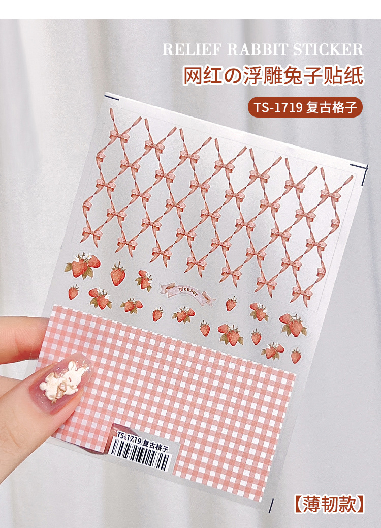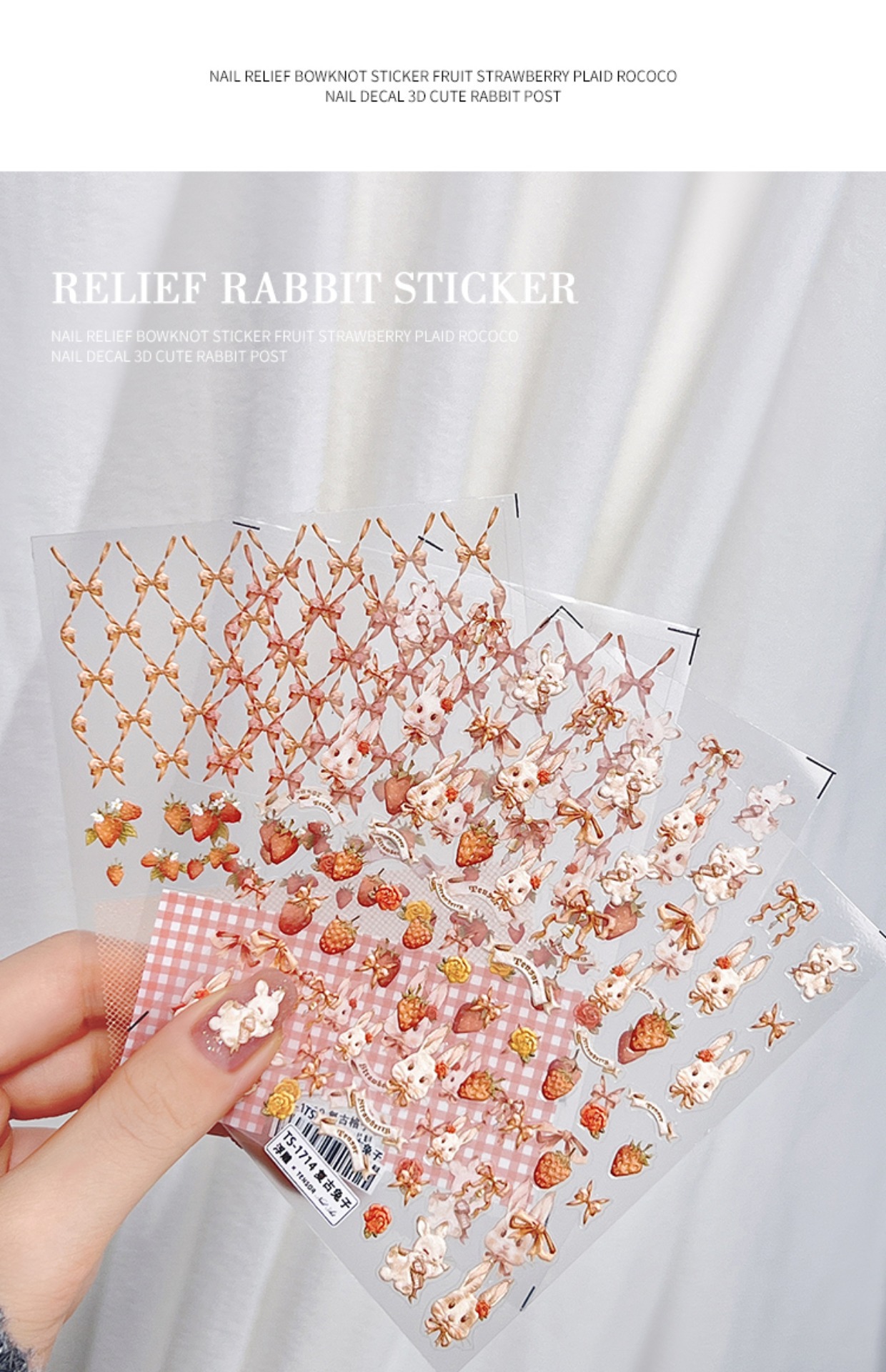 네일 아트 양각 빈티지 토끼 스티커 딸기 격자 무늬 로코코 네일 데칼 스테레오 보우 스티커스토어 가기