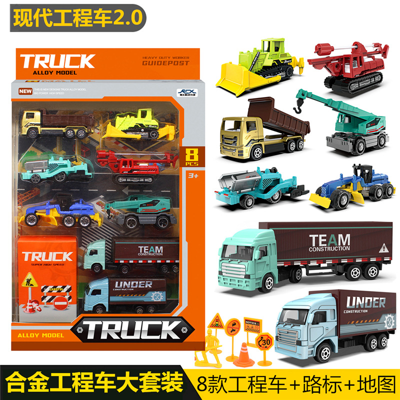 【商品】1:64 8款合金现代工程车模型套装(带路标地图)