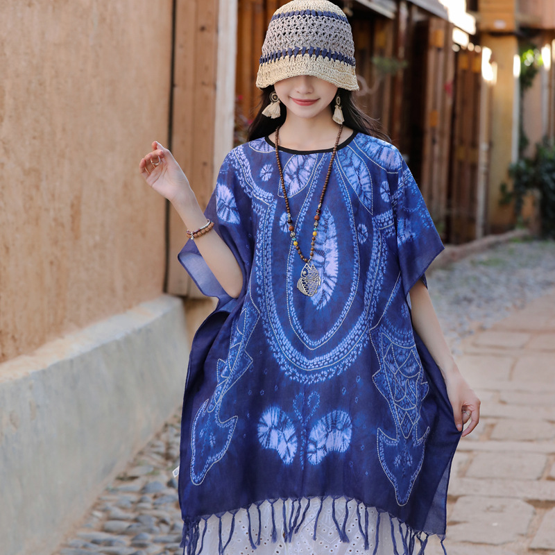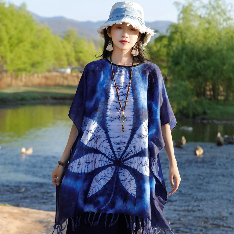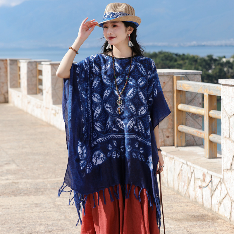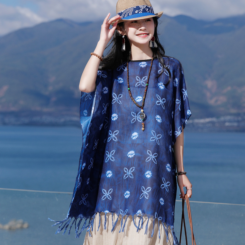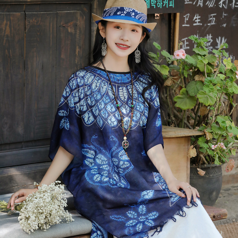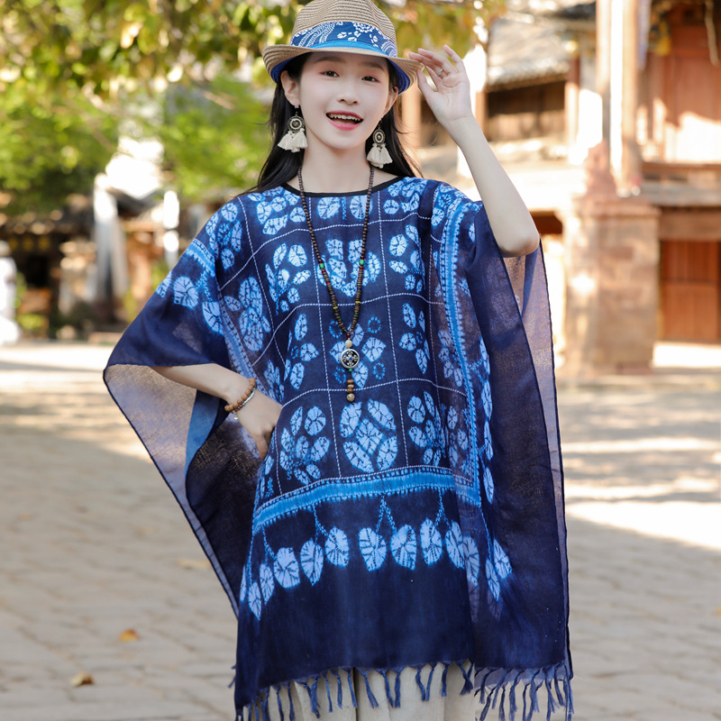 윈난 리장 블루와 화이트 모조 타이 다이 기하학적 마름모 외부 숄 블루와 화이트 도자기 민족 스타일 여행 자외선 차단제 망토 여성