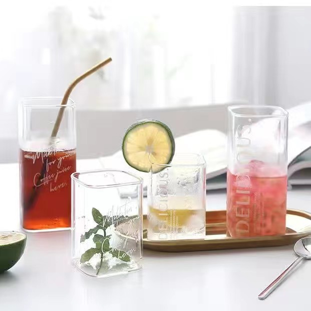 사각 유리 고온 내성 폭발 방지 고 붕규산 유리 과일 주스 찬 음료 컵 키 크고 짧은 사각 컵 북유럽 하이 컬러 값스토어 가기