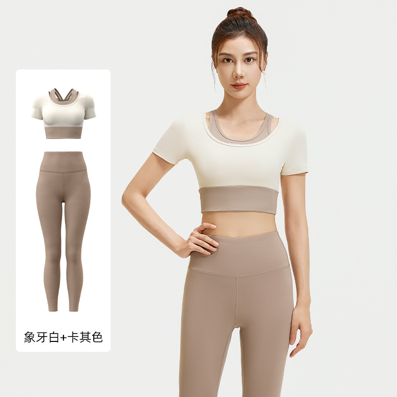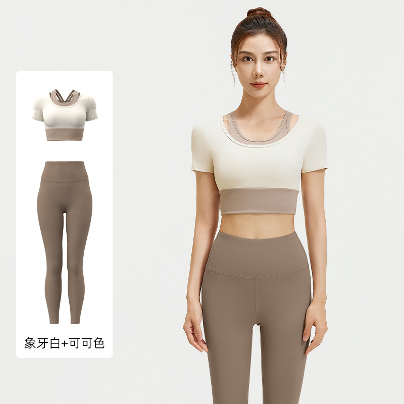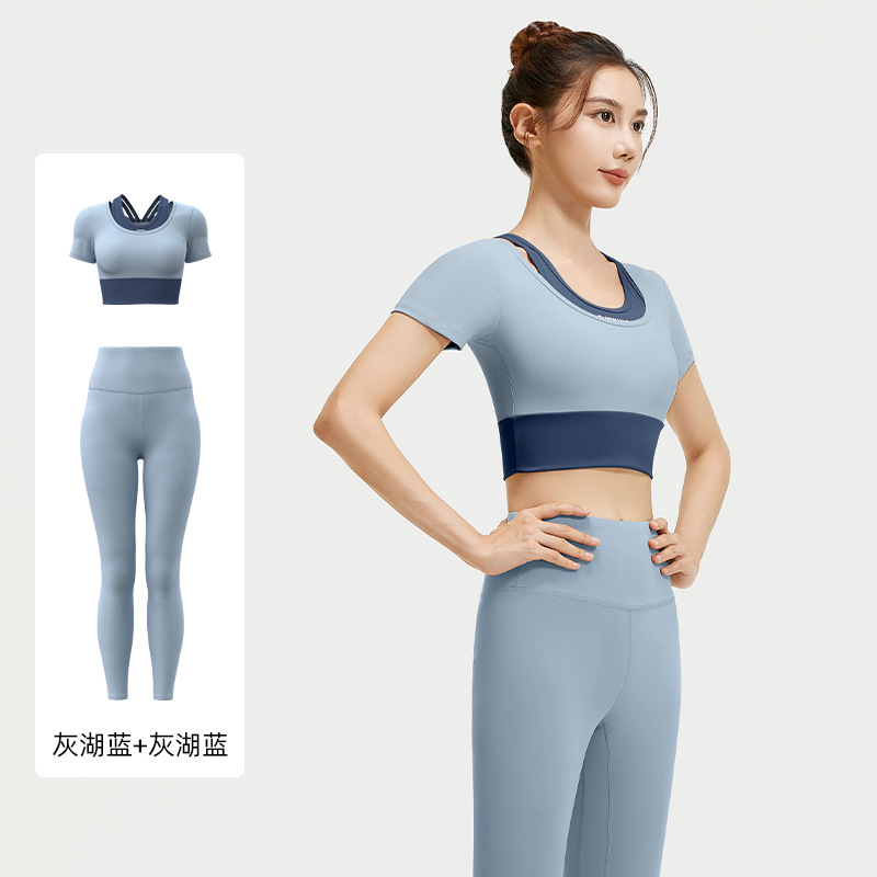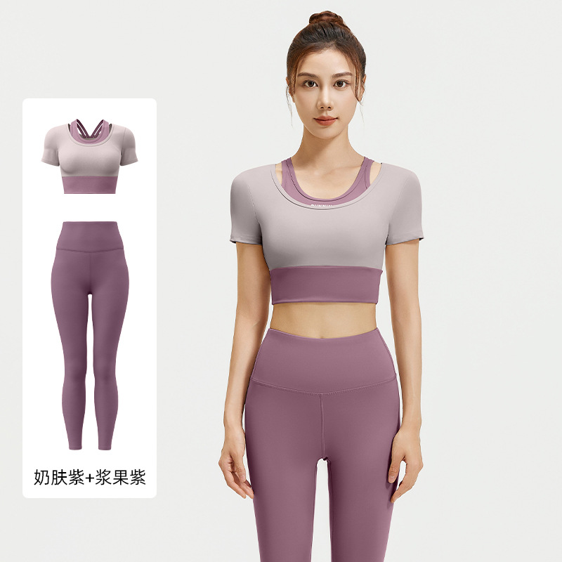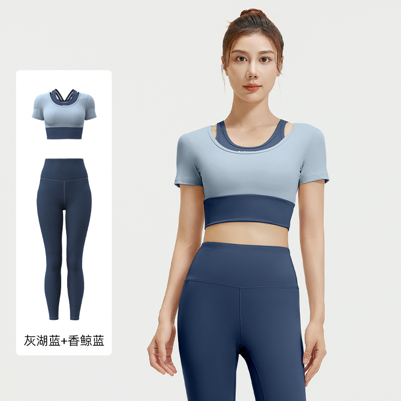 새로운 요가 세트 브라 프리 요가 의류 컬러 매칭 가짜 투피스 슬림 타이트 피트니스 의류 세트