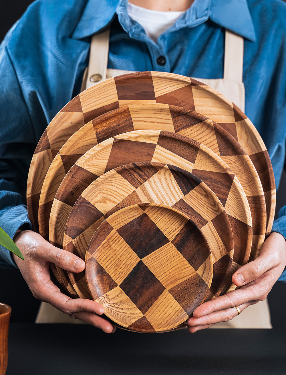 재고 창조적 인 라운드 흑백 바둑판 판 판 호텔 트레이 가정 너도밤 나무 전체 나무 과일 접시 도매스토어 가기