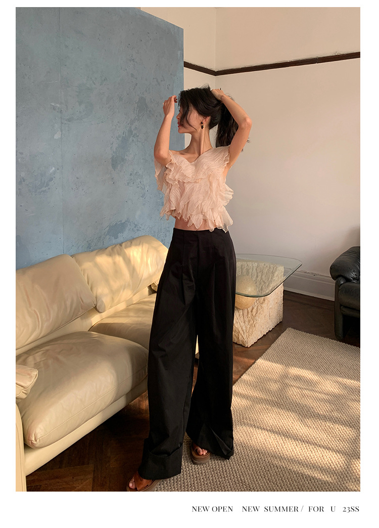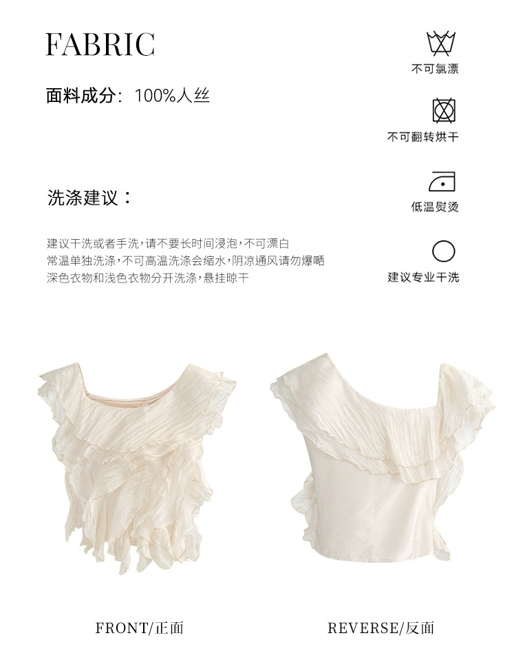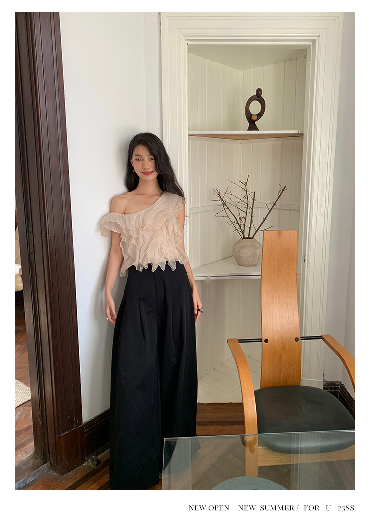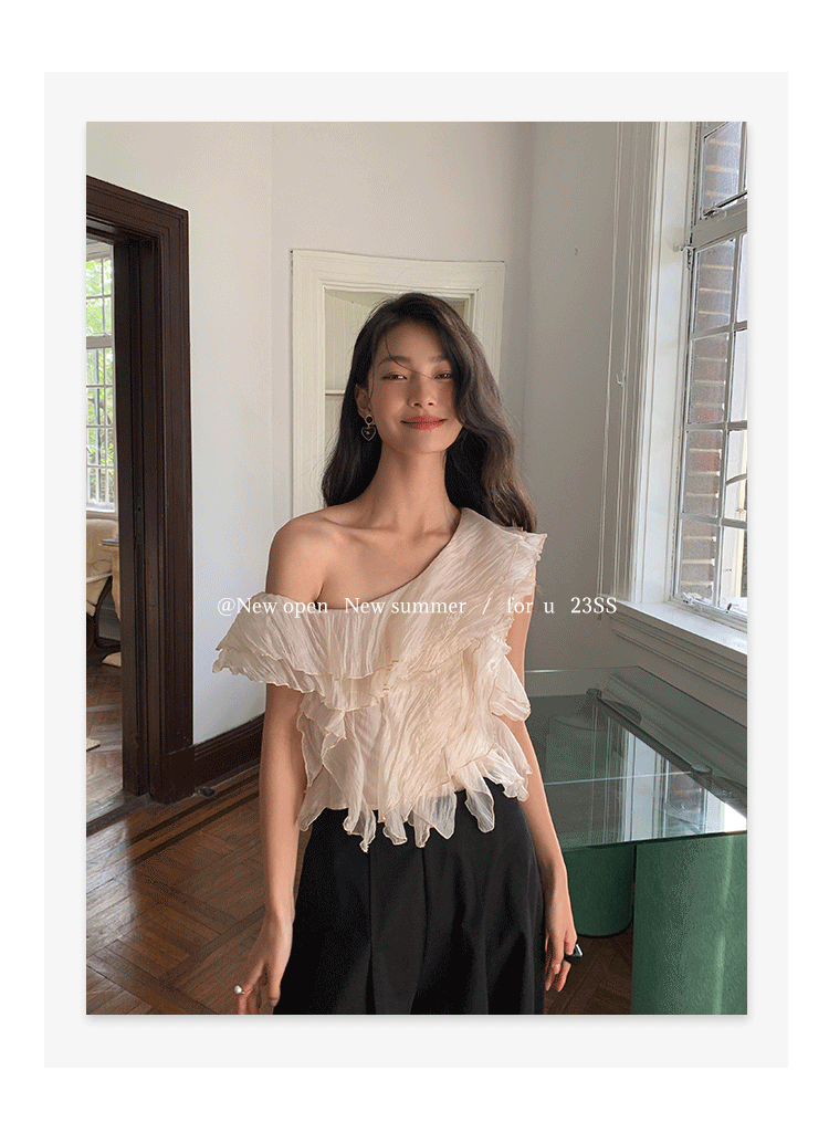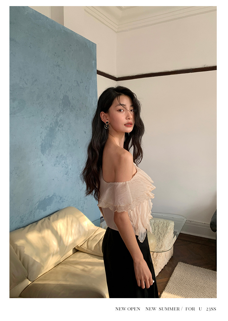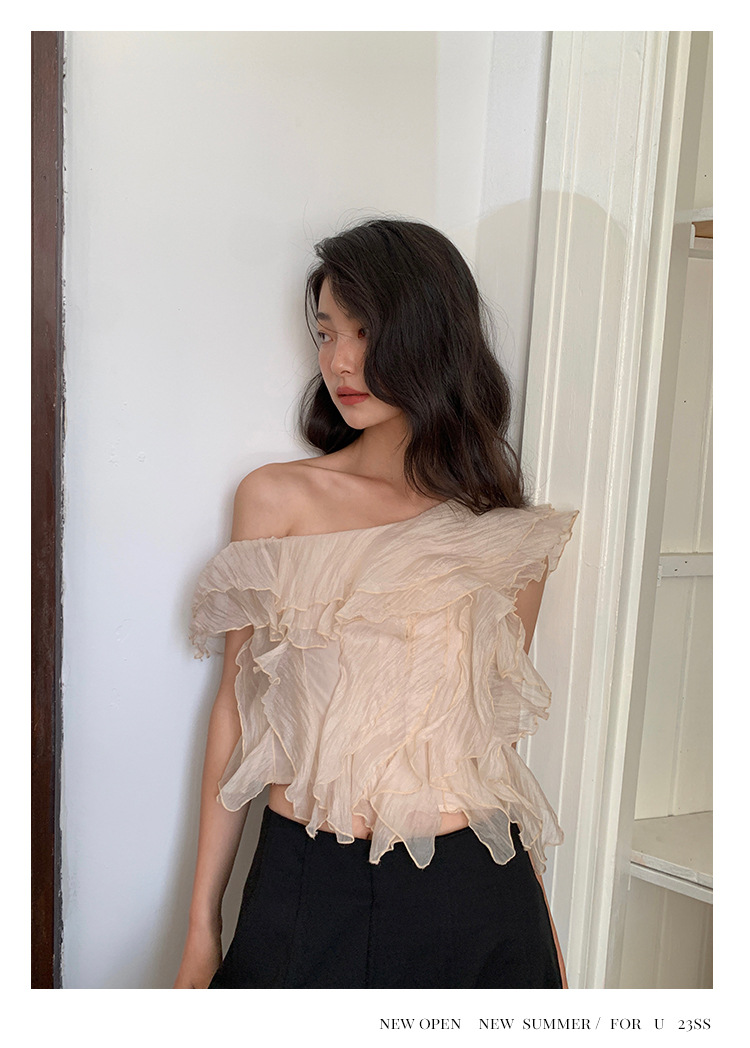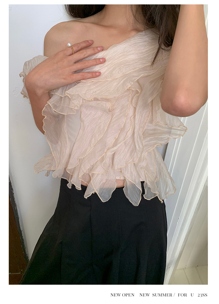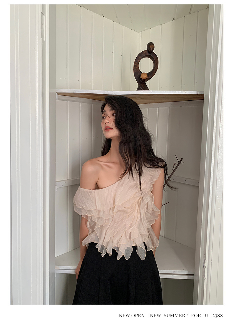 Quanlimei NEW OPEN 기울어 진 어깨 탑 2024 여름 프랑스 스타일 달콤한 러플 쉬폰 셔츠 82570