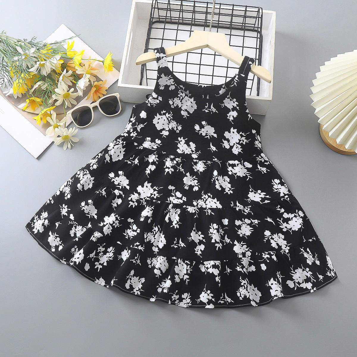 새로운 여아 면 실크 원피스 2025 여름 스타일리시한 꽃무늬 공주 드레스 어린이용 얇은 끈 원피스스토어 가기