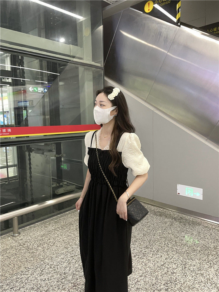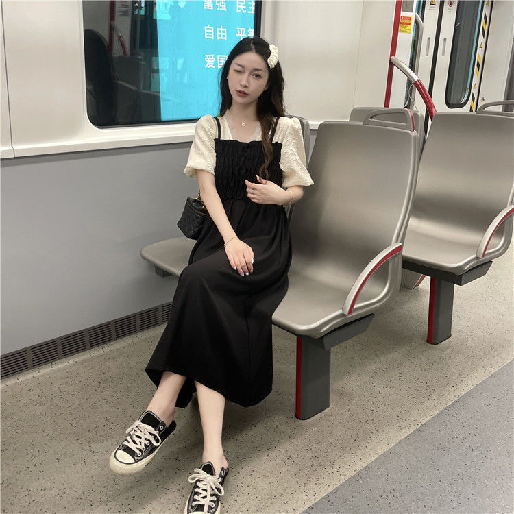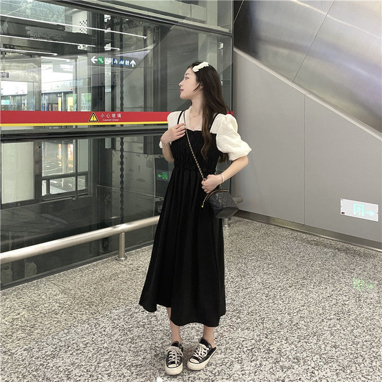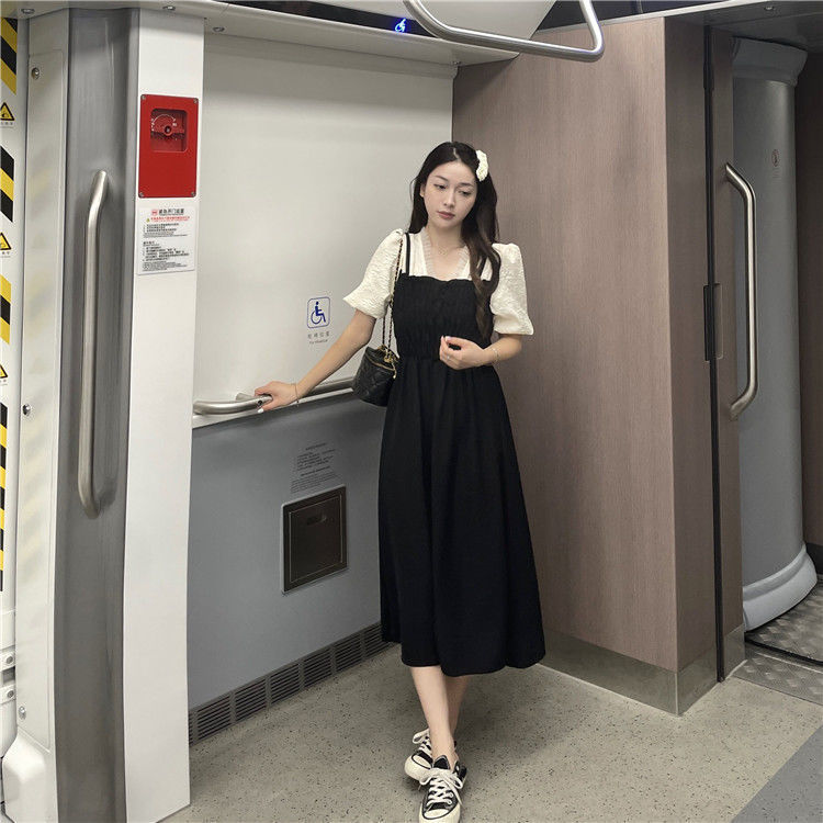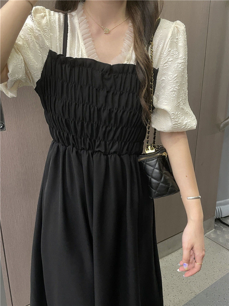가짜 투피스 원피스 여자의 여름 2023 신상품 프랑스 스타일 복고풍 슬리밍 블랙 슬링 반팔 작은 블랙 원피스스토어 가기