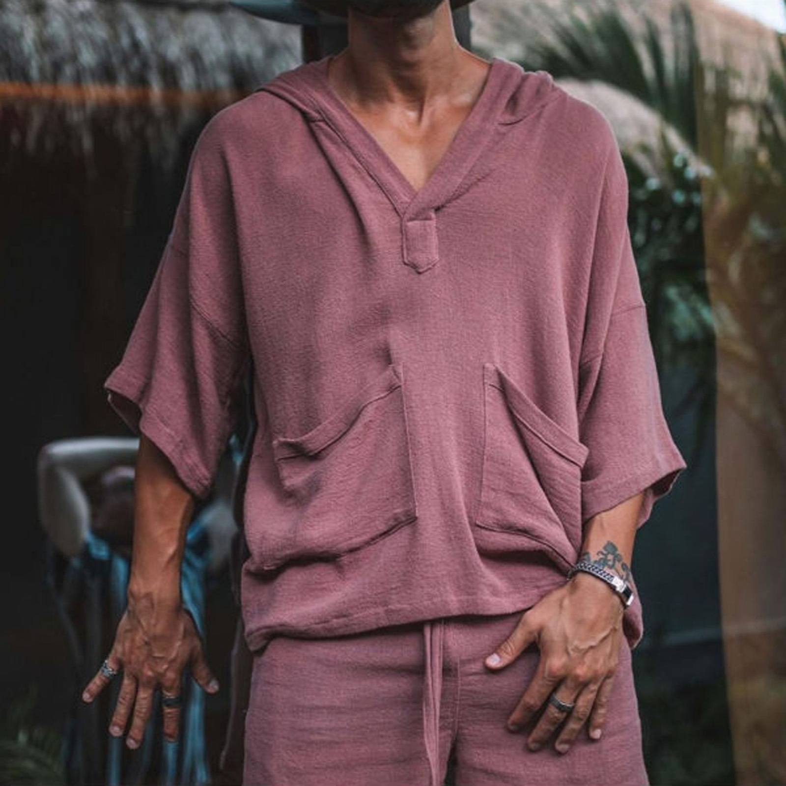 2023 유럽 및 미국 크로스 보더 새로운 반팔 반바지 투피스 면 및 린넨 루즈한 캐주얼 스포츠 중소매 세트 남성복