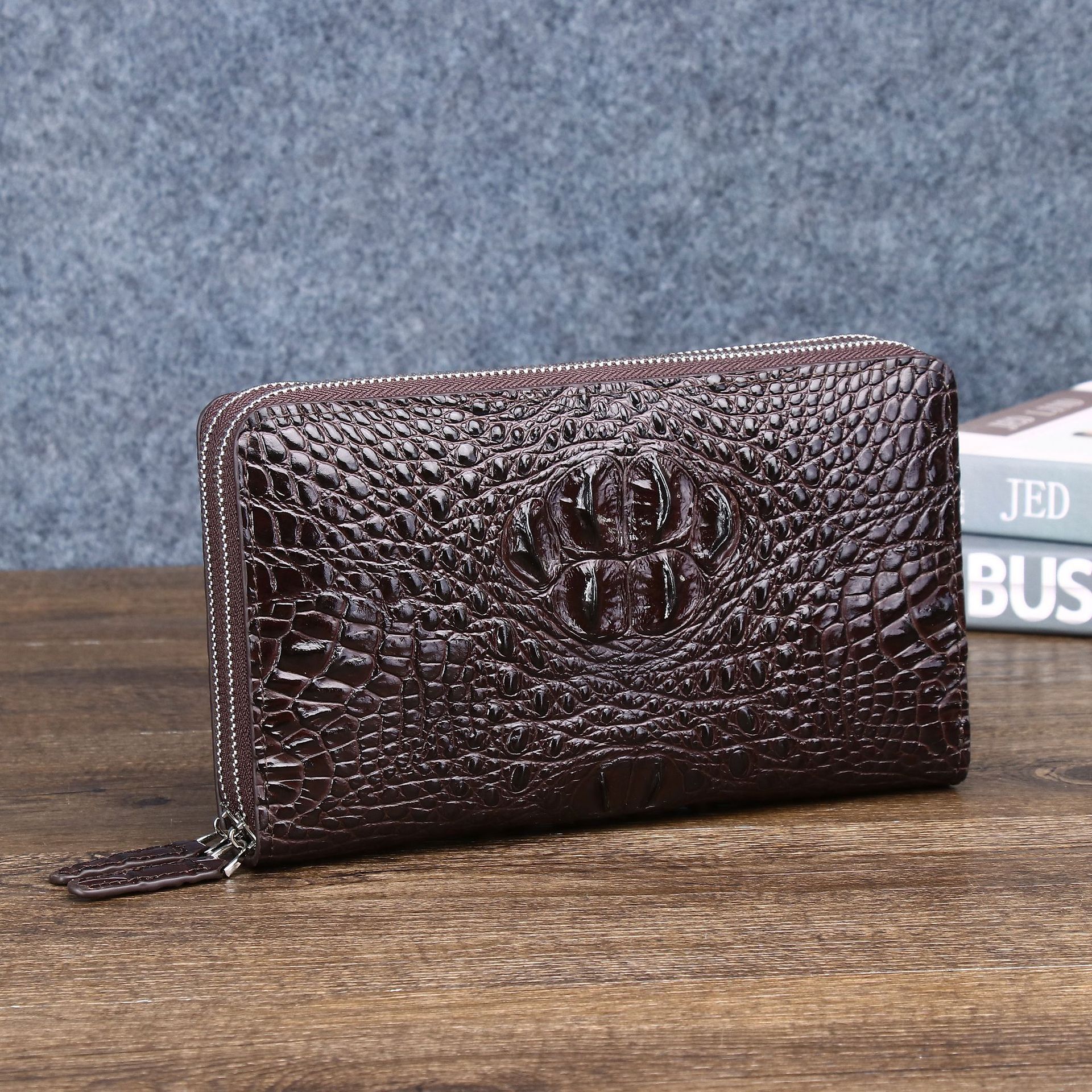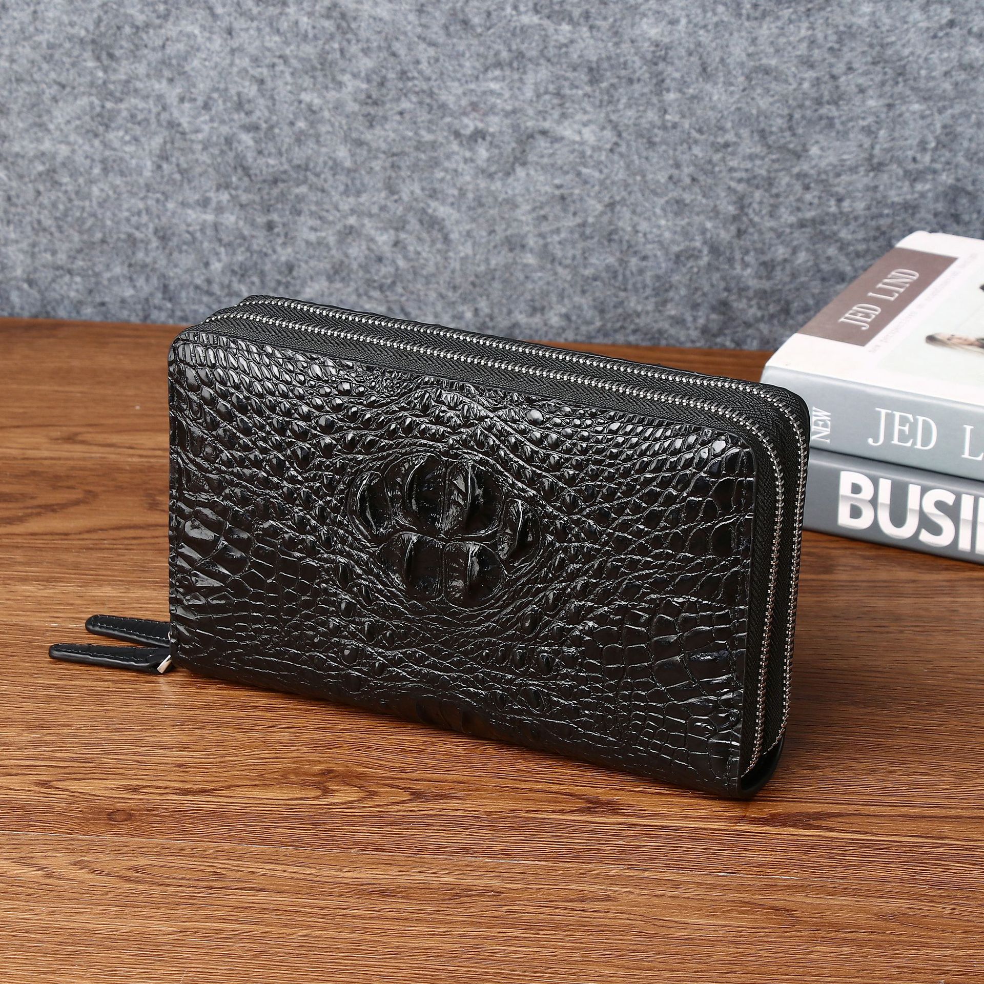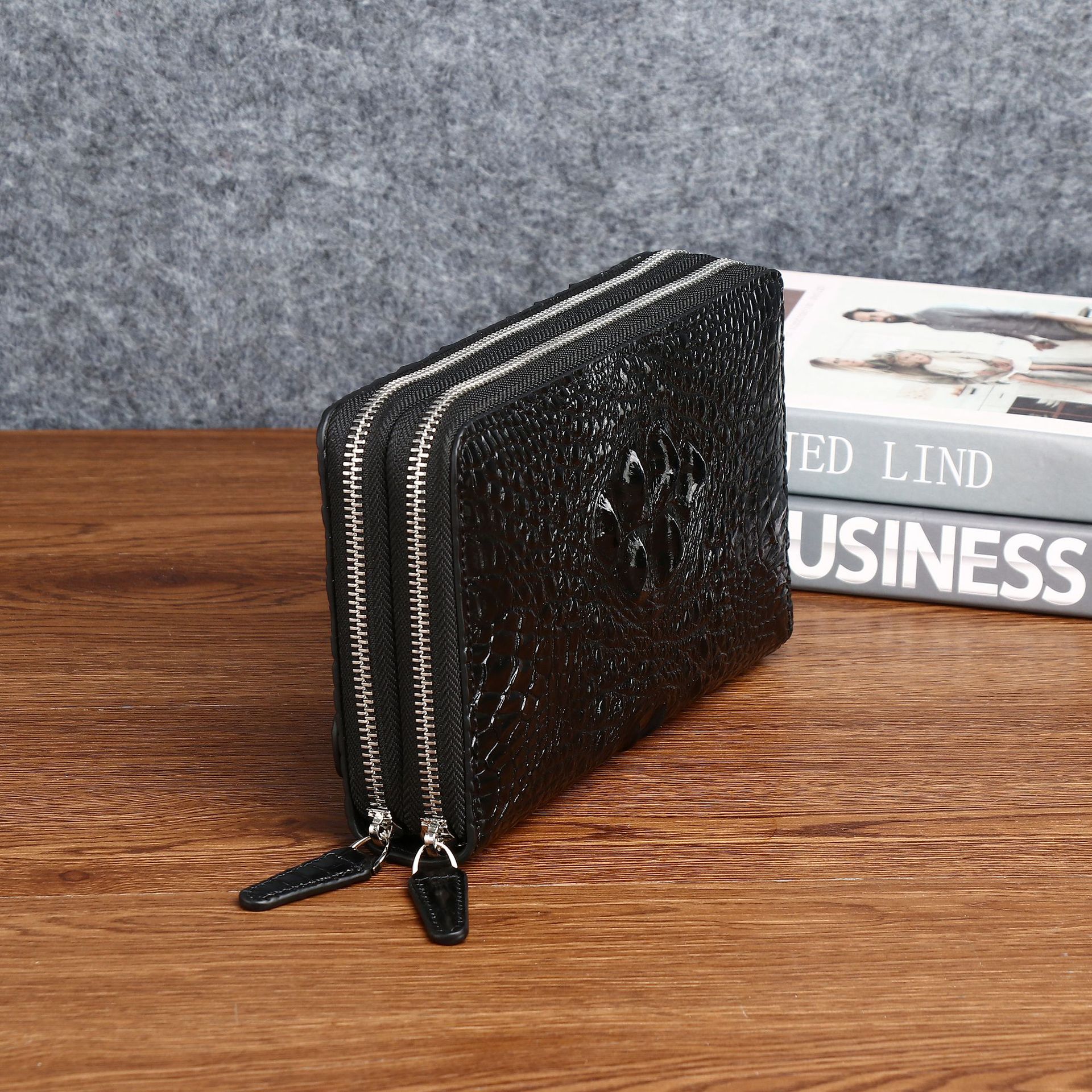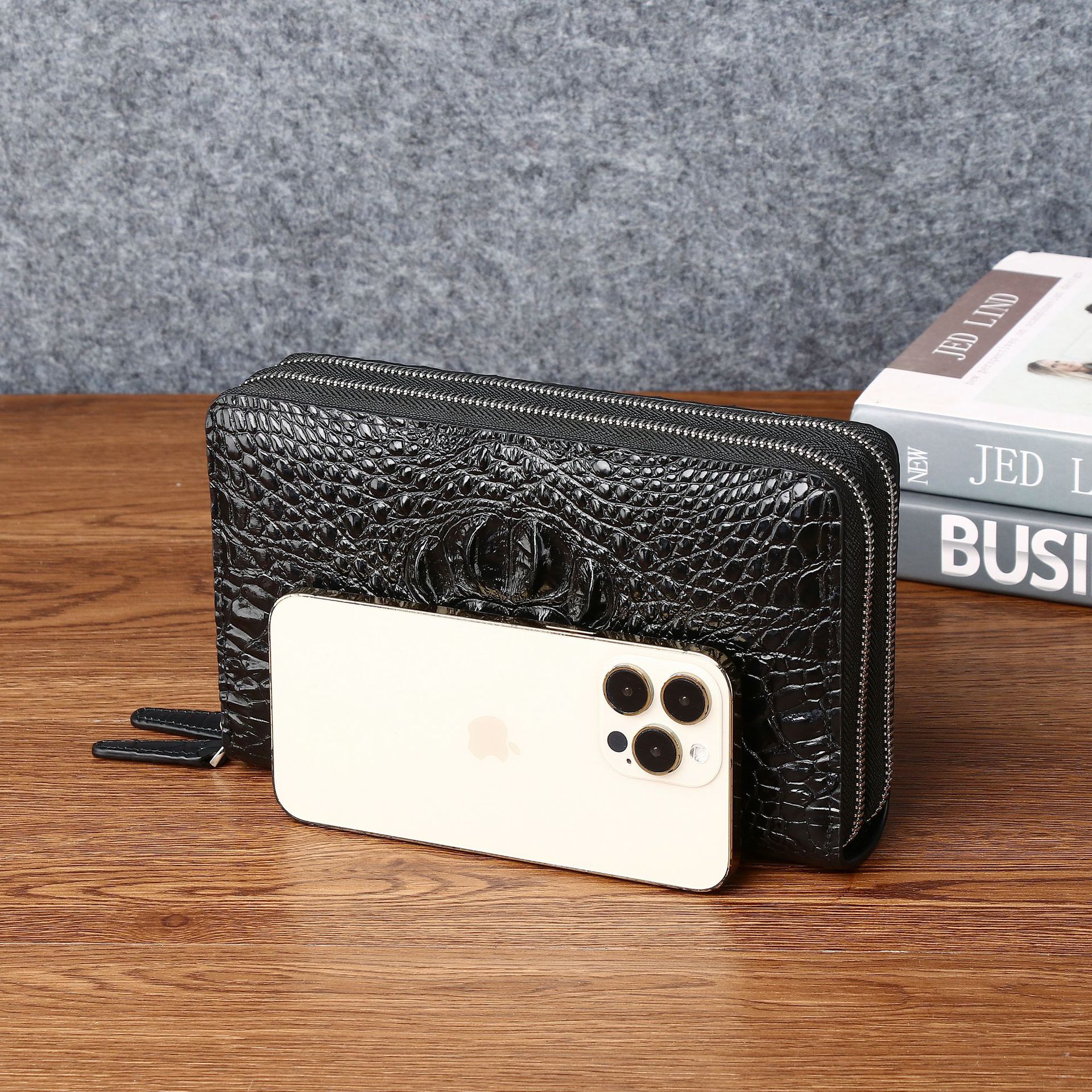 악어 물고기 뼈 패턴 남성용 더블 지퍼 핸드백 대용량 클러치 멀티 카드 지갑 정품 가죽 다기능 핸드백 트렌디
