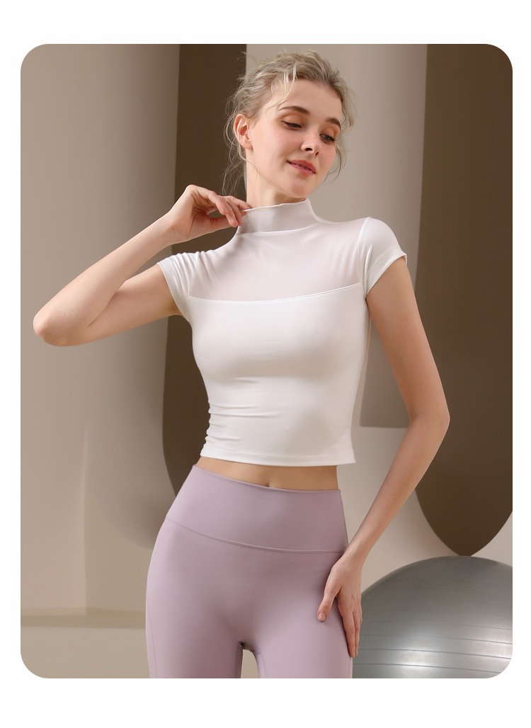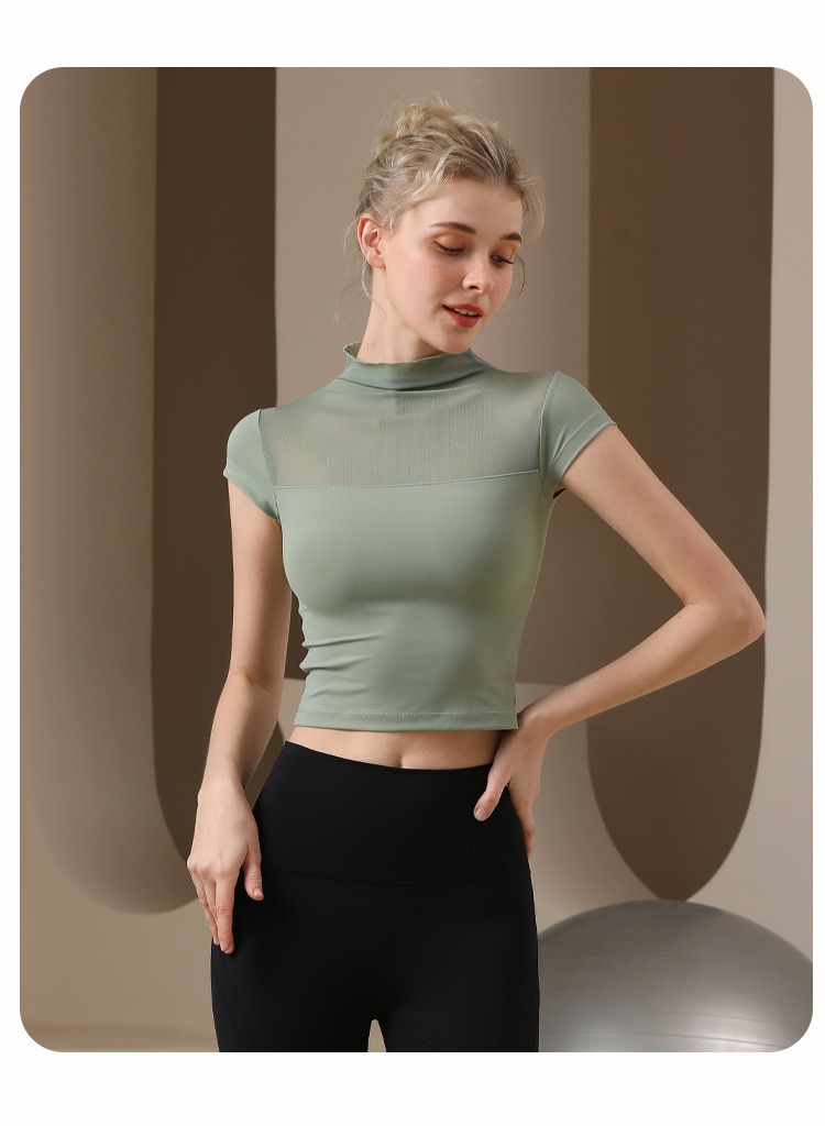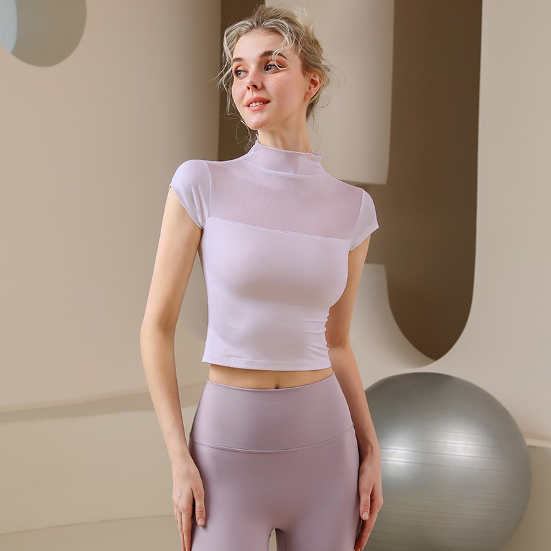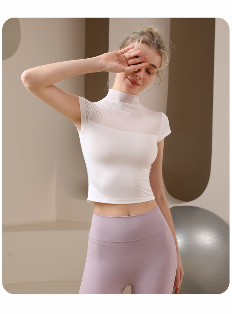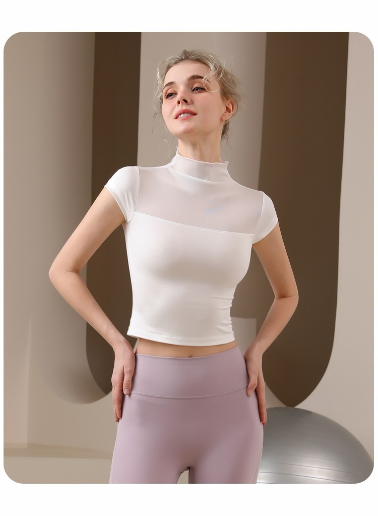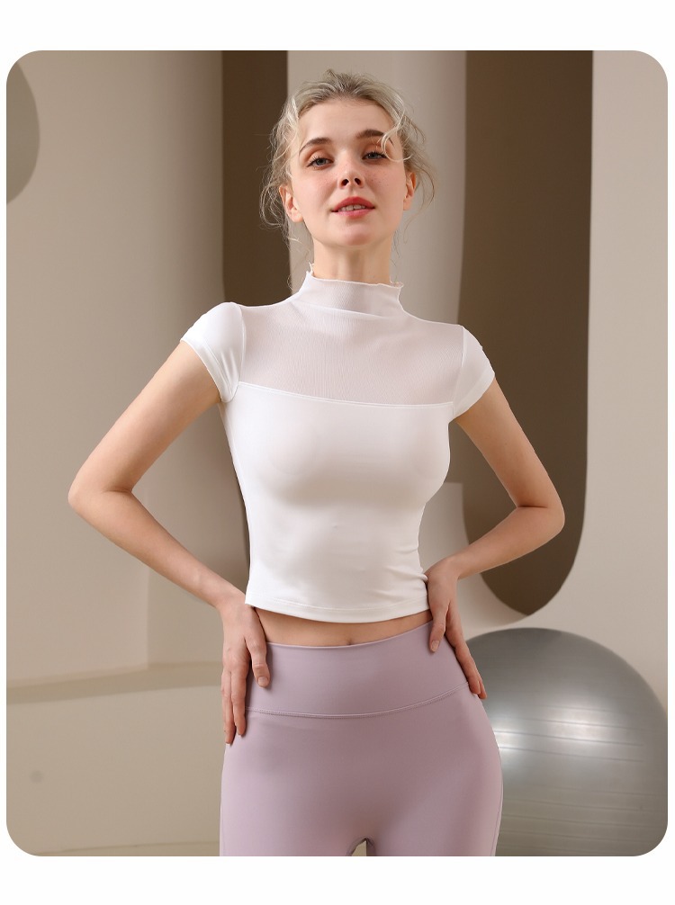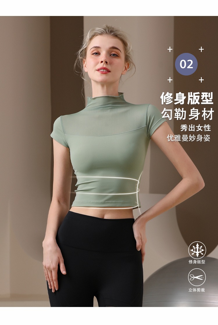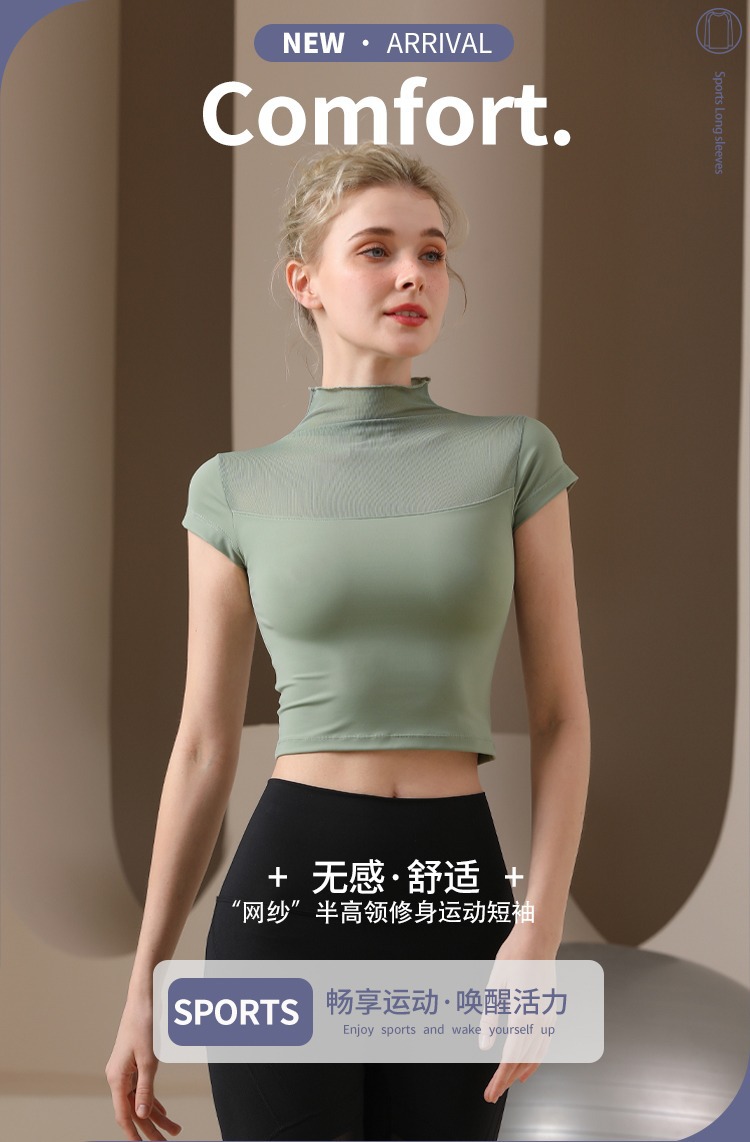 크로스 보더 하이 넥 요가 의류 여성용 티셔츠 섹시한 메쉬 스포츠 반팔 꽉 끼는 슬리밍 고탄성 러닝 피트니스 탑