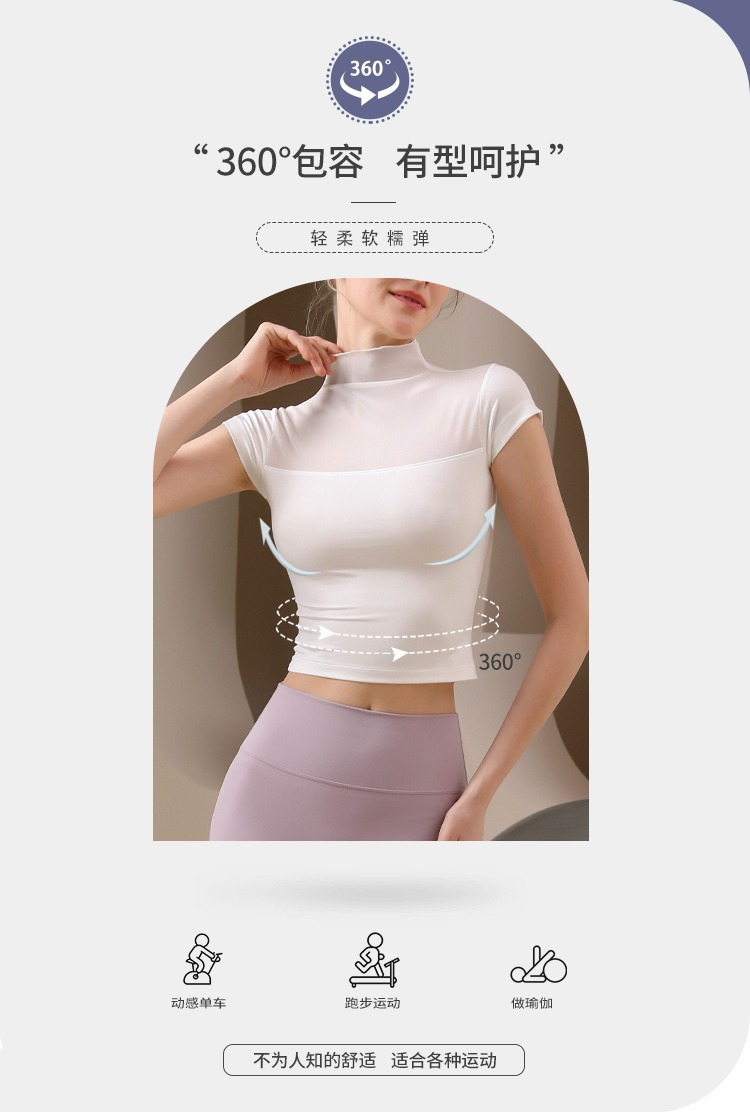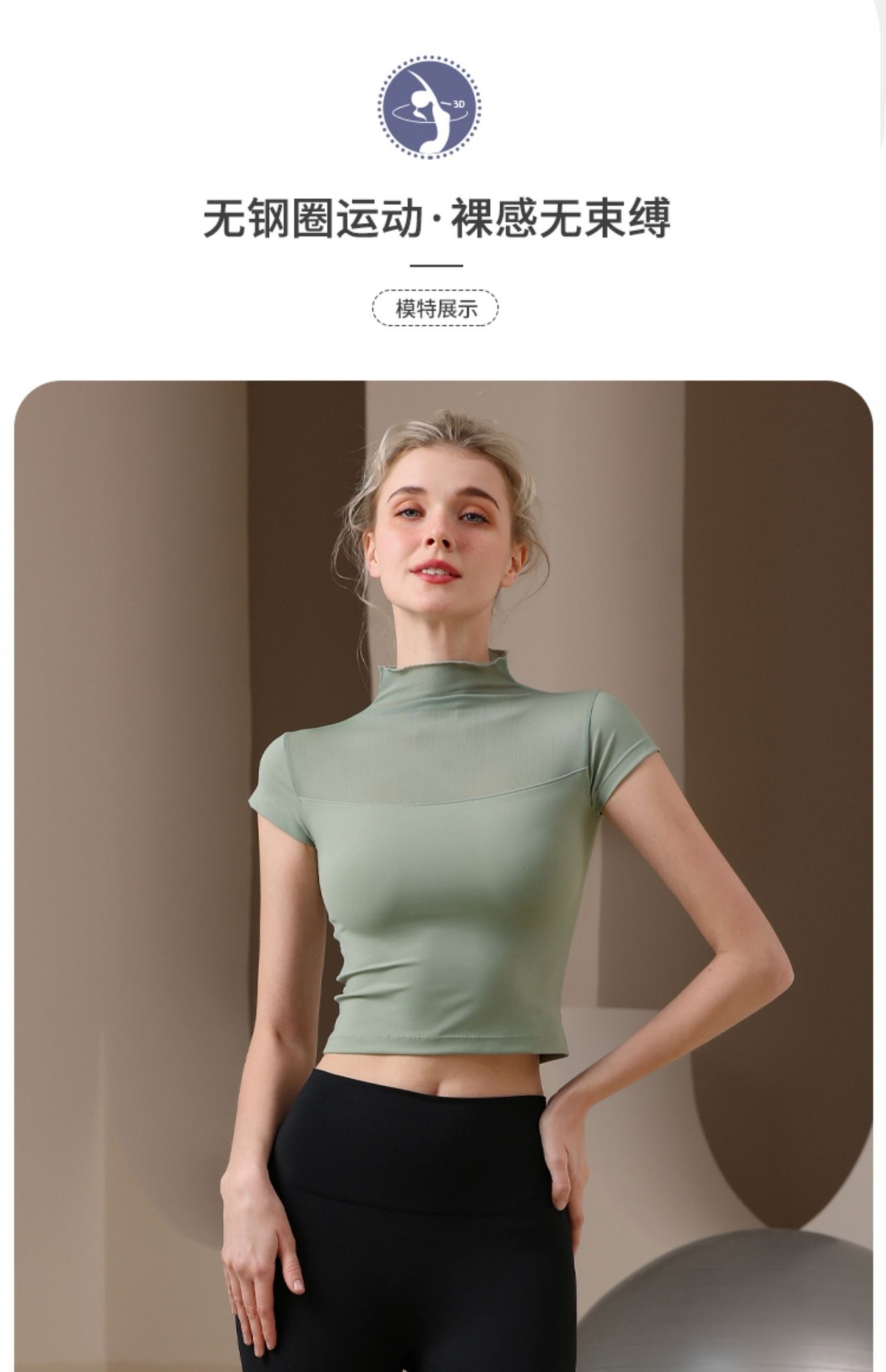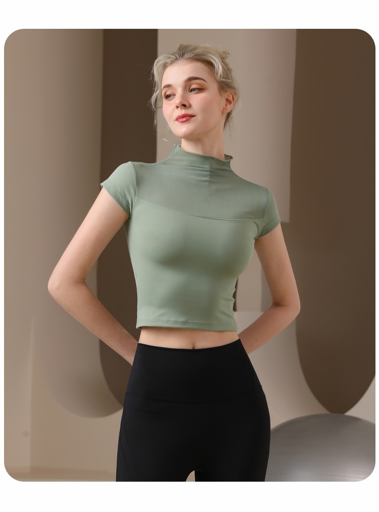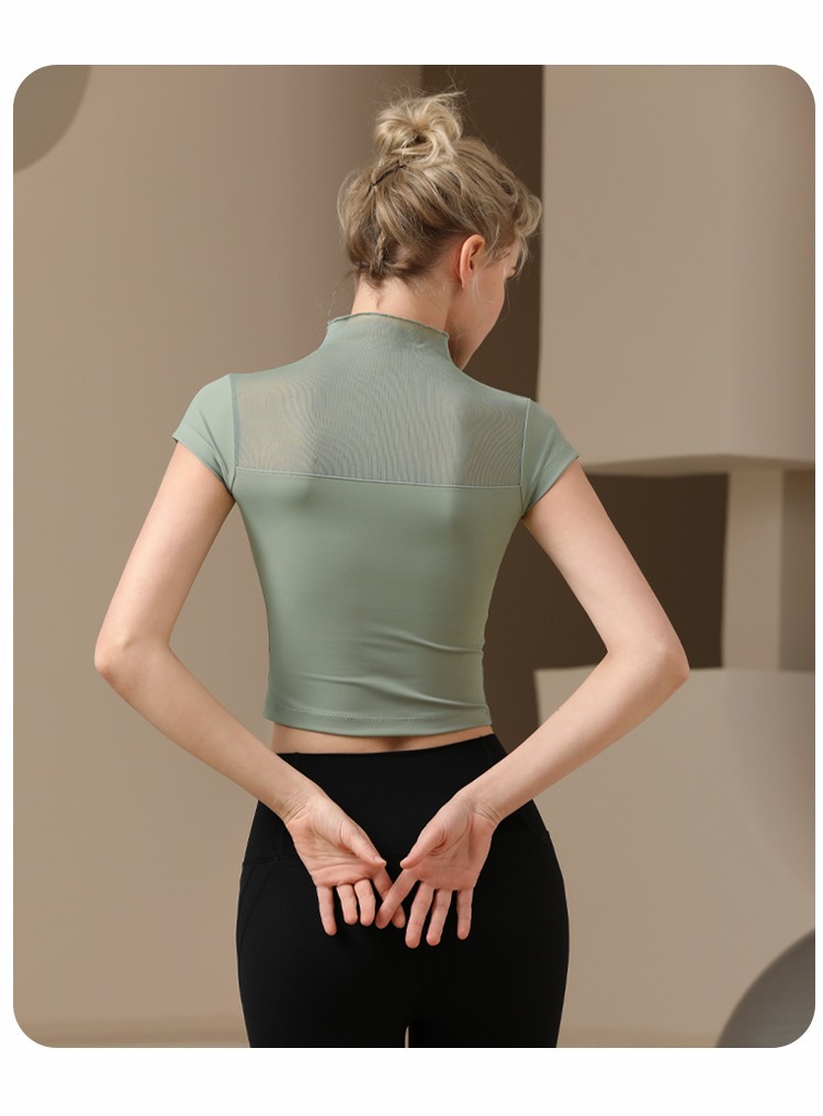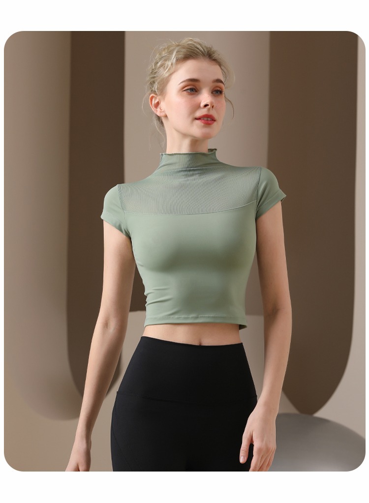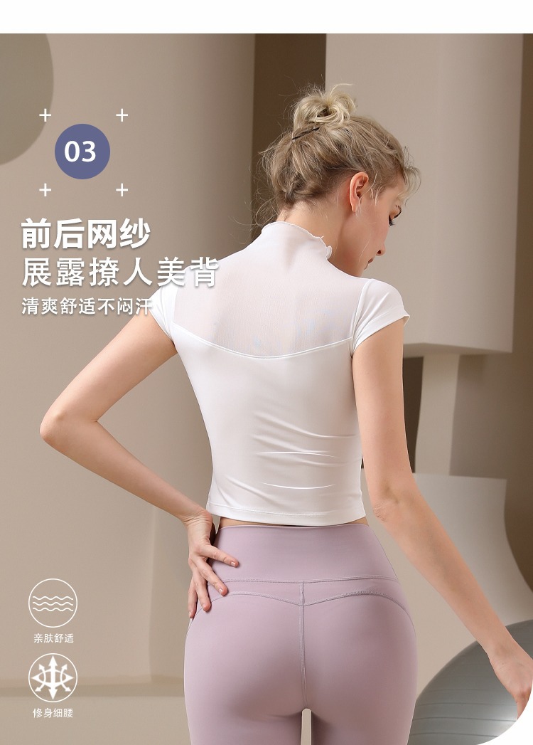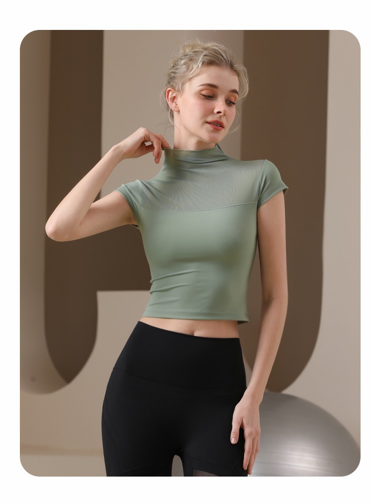크로스 보더 하이 넥 요가 의류 여성용 티셔츠 섹시한 메쉬 스포츠 반팔 꽉 끼는 슬리밍 고탄성 러닝 피트니스 탑