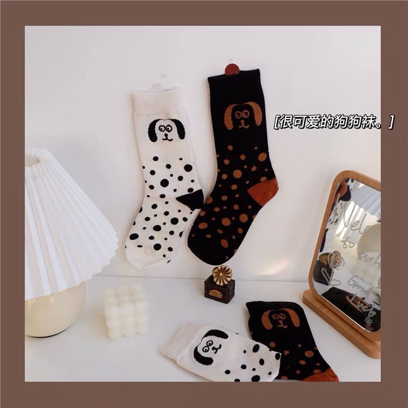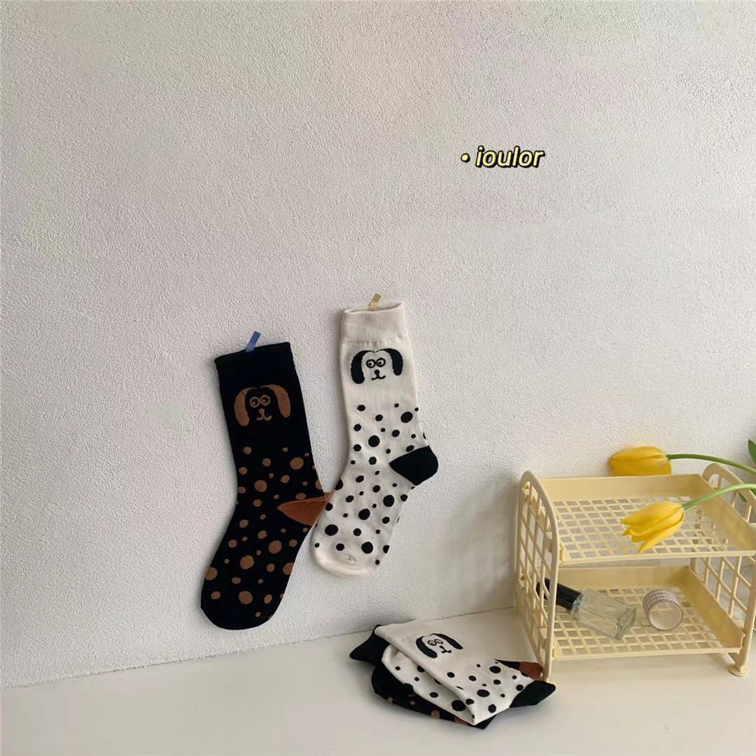 2021 새로운 한국 스타일 일러스트 흑백 점박이 강아지 동물 점 중형 양말 만화 양말