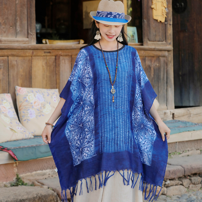 윈난 에스닉 스타일 타이 염색 숄 봄과 여름 선 스크린 숄 블루 염색 수제 술 긴 여행 케이프