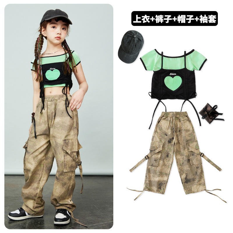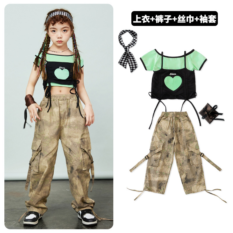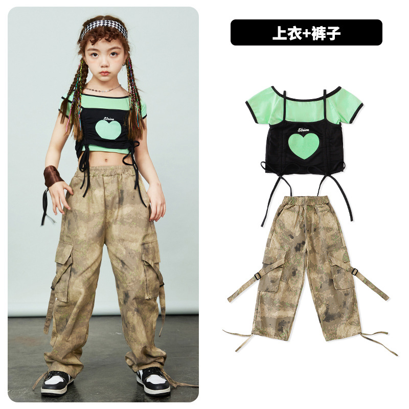 소녀 재즈 댄스 의류 모델 패션쇼 패션 멋진 패션 스트랩 가짜 투피스 배꼽 노출 아동용 댄스 복 공연 옷스토어 가기