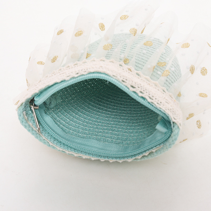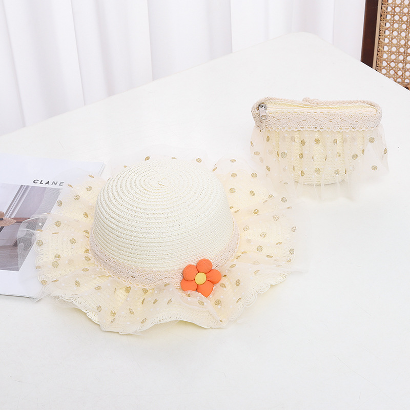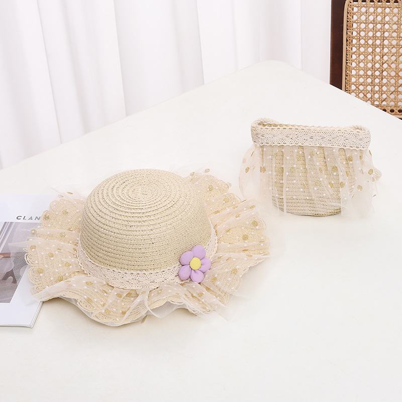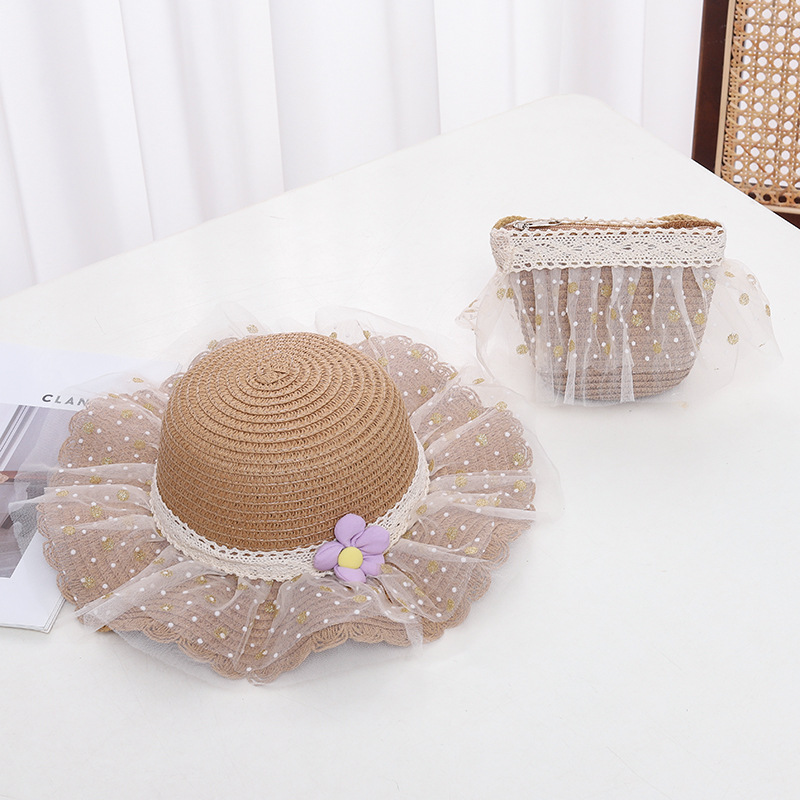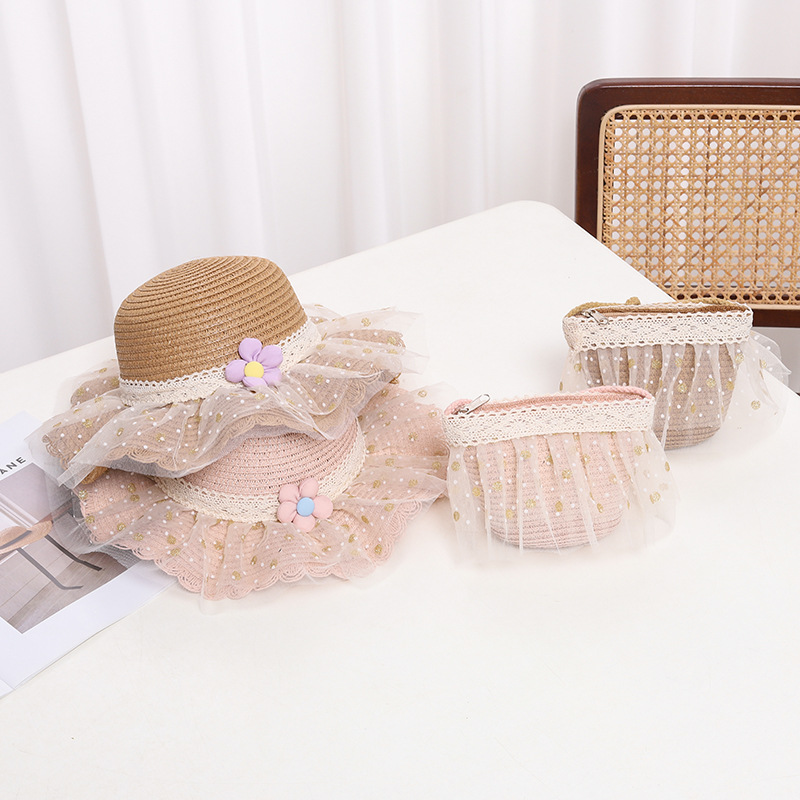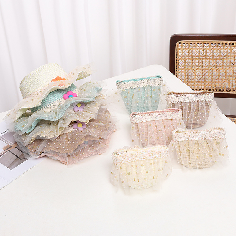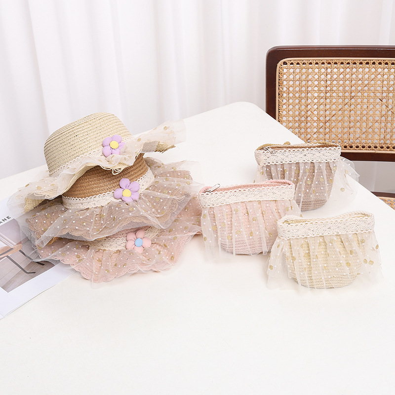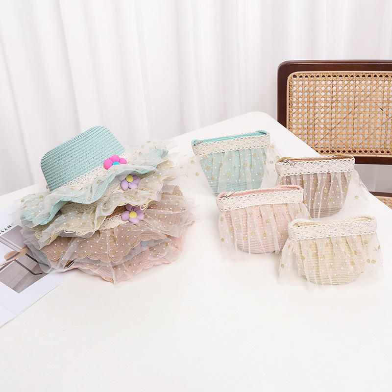 어린이 자외선 차단제 모자 여름 소녀의 차양 밀짚 모자 가방 세트 소녀 아기 소녀 세련된 레이스 공주 비치 모자스토어 가기