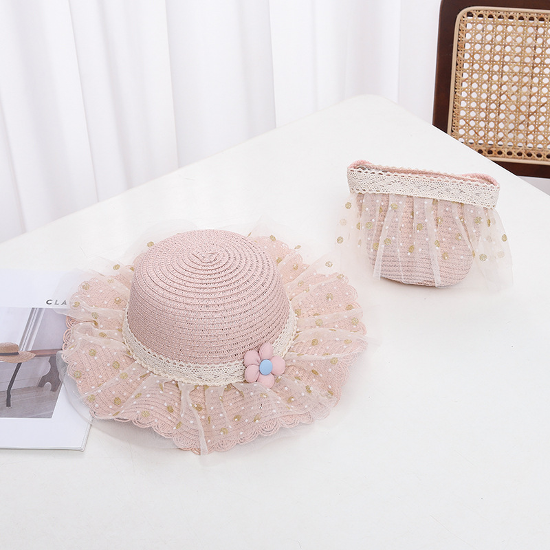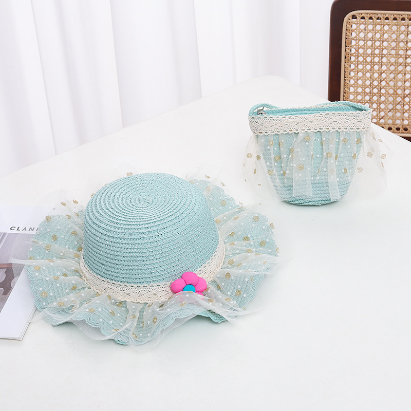 어린이 자외선 차단제 모자 여름 소녀의 차양 밀짚 모자 가방 세트 소녀 아기 소녀 세련된 레이스 공주 비치 모자