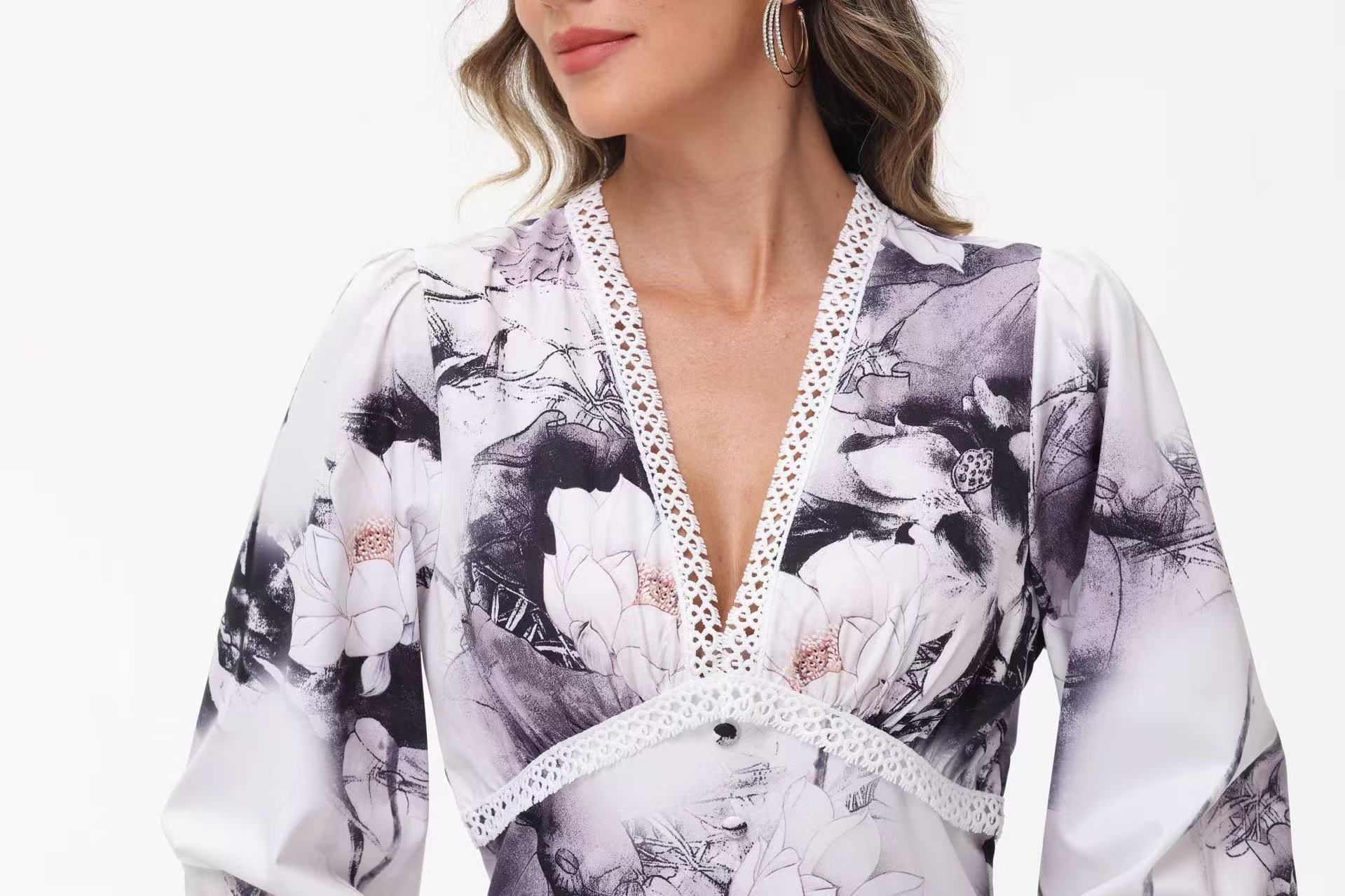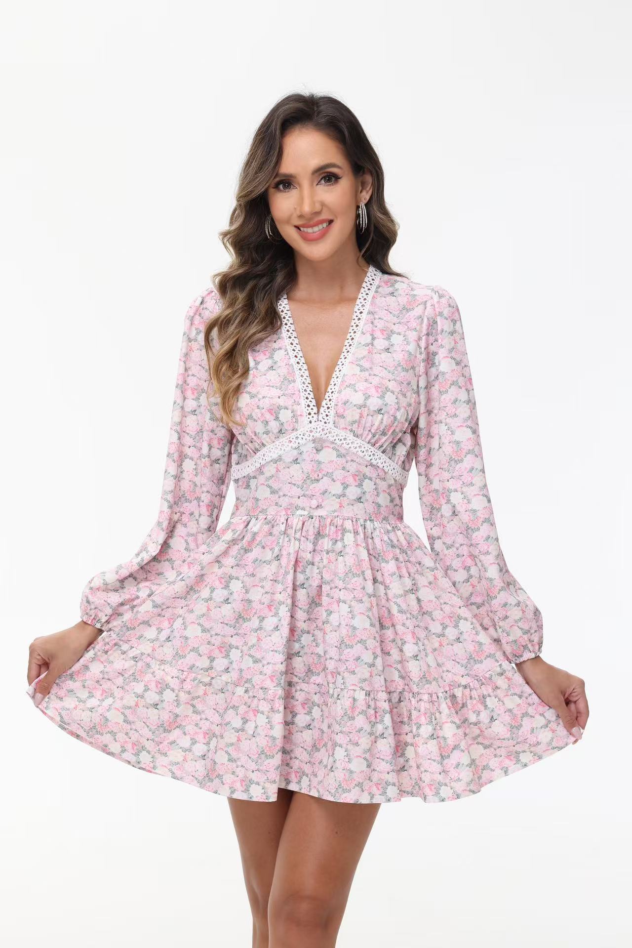 스팟 2023 유럽과 미국 여성의 봄 새로운 대외 무역 기질 달콤한 인쇄 V 넥 레이스 짧은 원피스