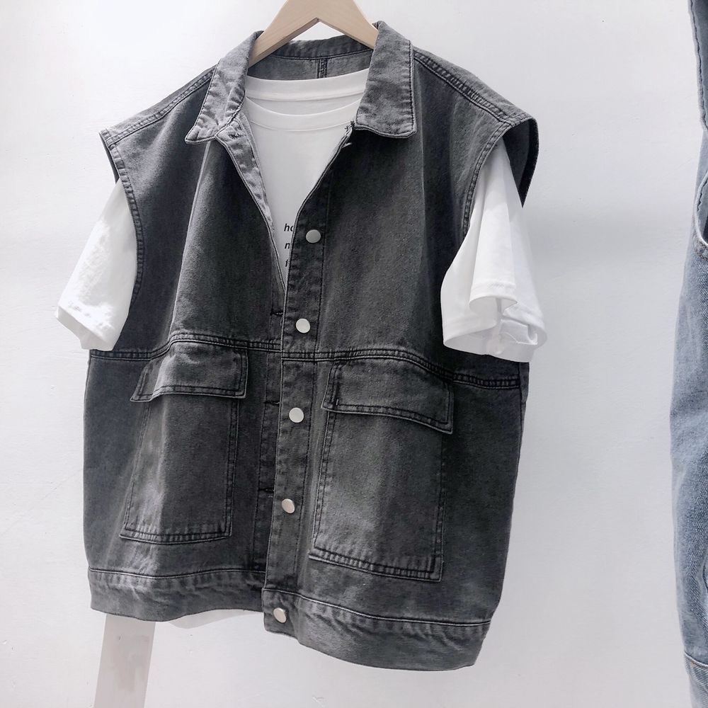 데님 조끼 빈티지 워싱 BF 스타일 툴링 데님 조끼 일본 커플 민소매 느슨한 모든 매치 재킷 여성용