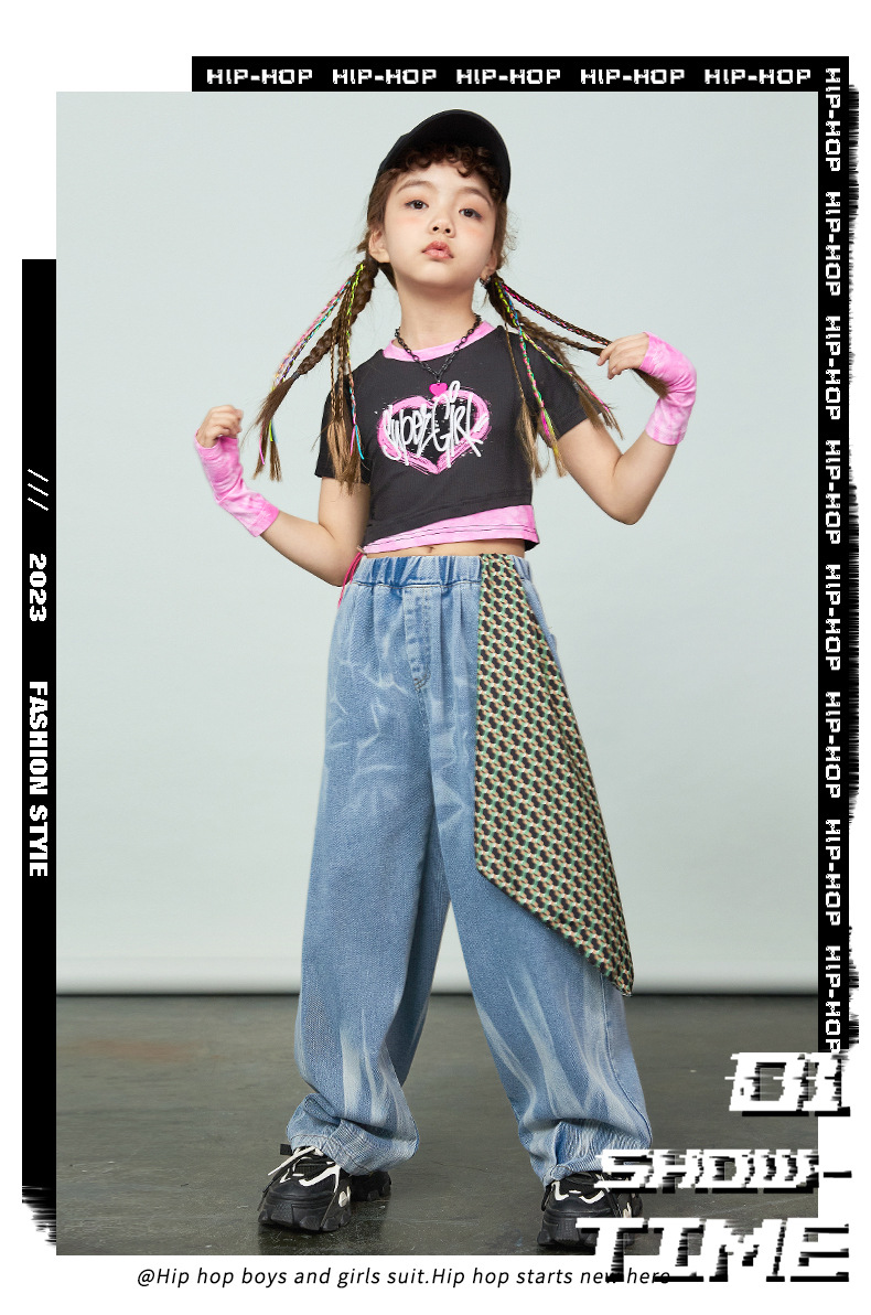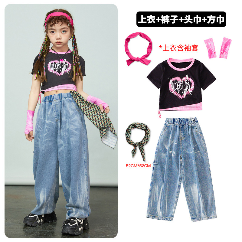 소녀 재즈 댄스 의류 어린이 캣워크 패션 멋진 유행 청바지 세트 배꼽 최고의 어린이 공연 의류 여름스토어 가기